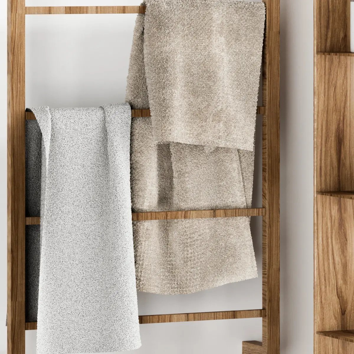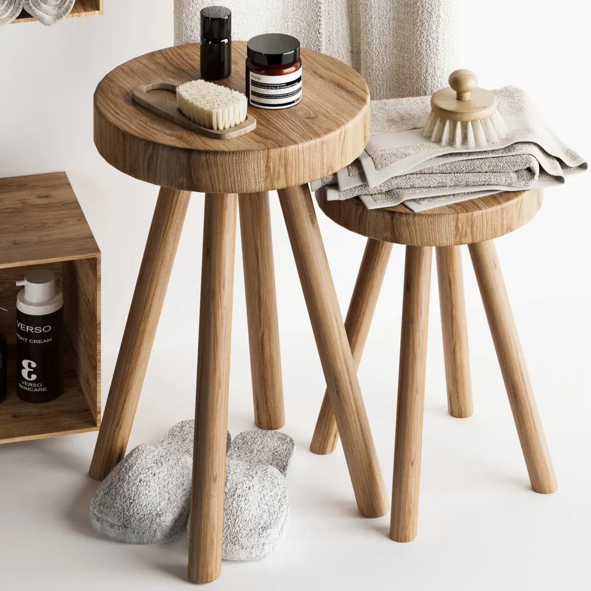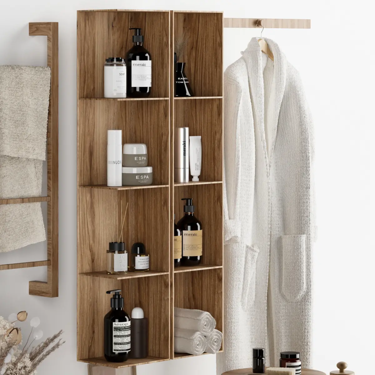 This product is a functional set designed to enhance and organize your bathroom and washroom space. With its modern design and natural wood elements, it brings warmth and tranquility to the environment. The set includes wall-mounted shelves, a towel rack, a robe hanger, and versatile wooden stools, providing ample space for storing toiletries, towels, and scented candles.