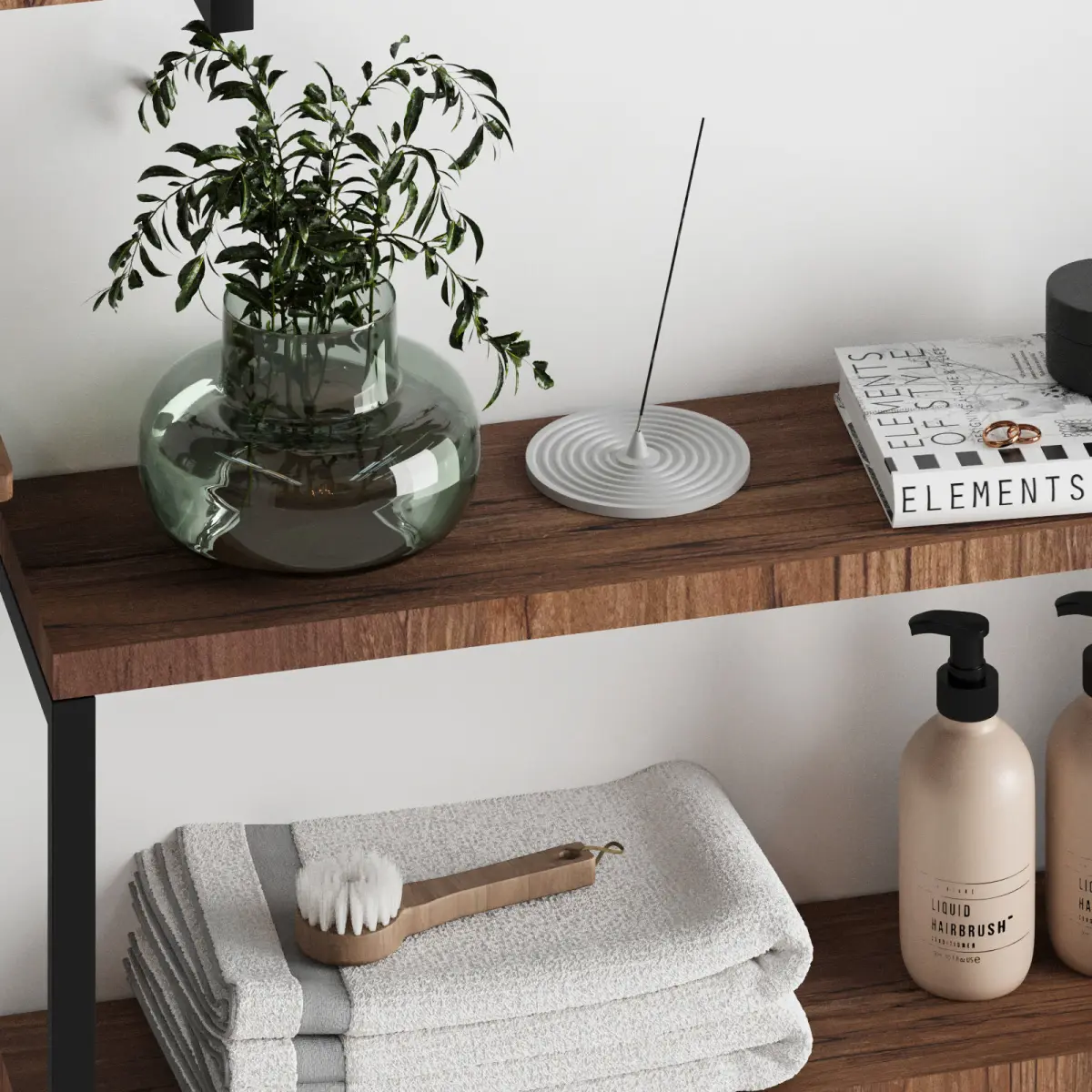 This 3D model features a set of modern wall-mounted shelves designed for bathroom spaces. The combination of matte black metal frames and natural wood offers a sleek and contemporary look. The set includes multiple functional shelves,, towel holders, and space for toiletries and decorative plants. This design is ideal for creating an organized and stylish bathroom interior.