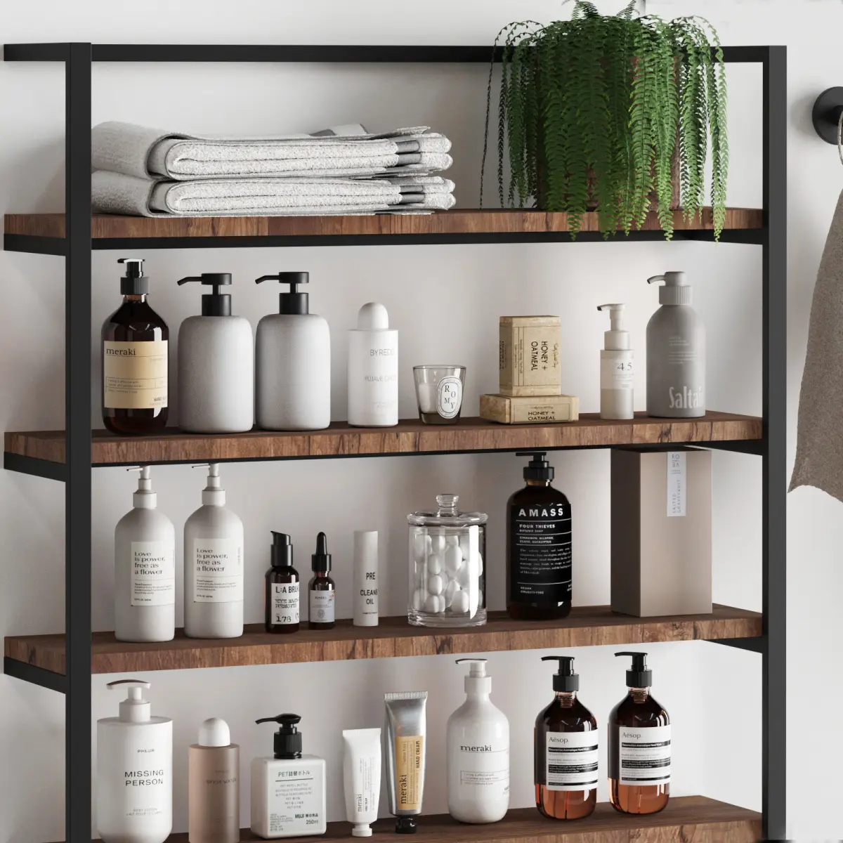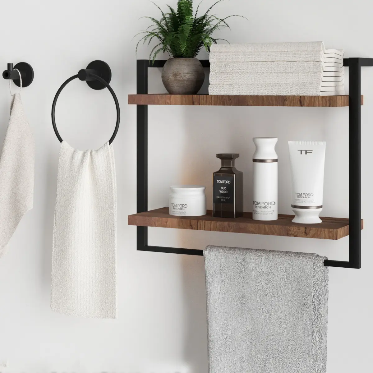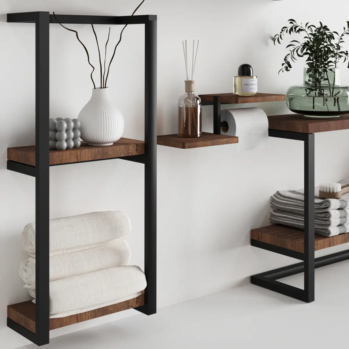 *Materials: Matte black metal and natural wood*Functional shelving for toiletries, towels, and decor*Modern and minimalist design suitable for bathroom or washroom interiors