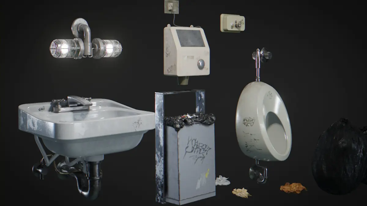 Bathroom accessories Pack for Blender 3D. PBR Materials, Ready for Games. 10 3D Models in Pack.WC, Basket, Wall Lamp, Ceiling Lamp, Soup, Trash, Cans, Sink, Bidet, Doors with Tags.