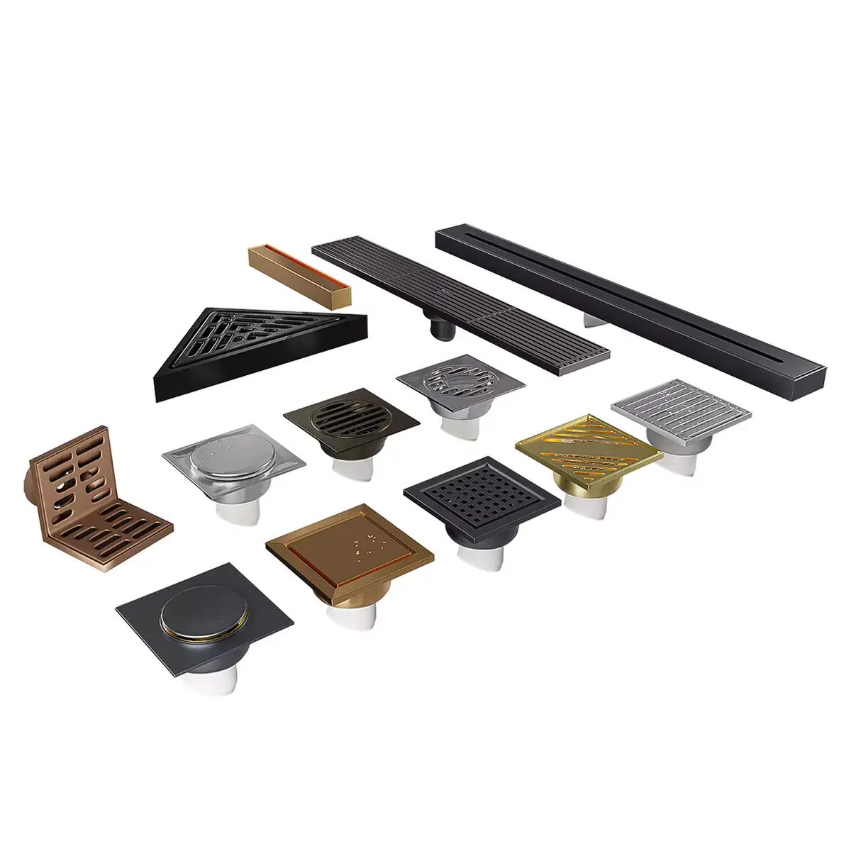 Professional 3D collection of 13 floor and shower drain grates: various shapes (square, slotted, triangular) with metal finishes (matte chrome, gold, brass) and plastic. PBR texture for realistic visualisation, quad-based mesh, accurate dimensions. FBX/OBJ formats included. Perfect for visualising interiors and scenes with plumbing fixtures. Several high-resolution renders provided.