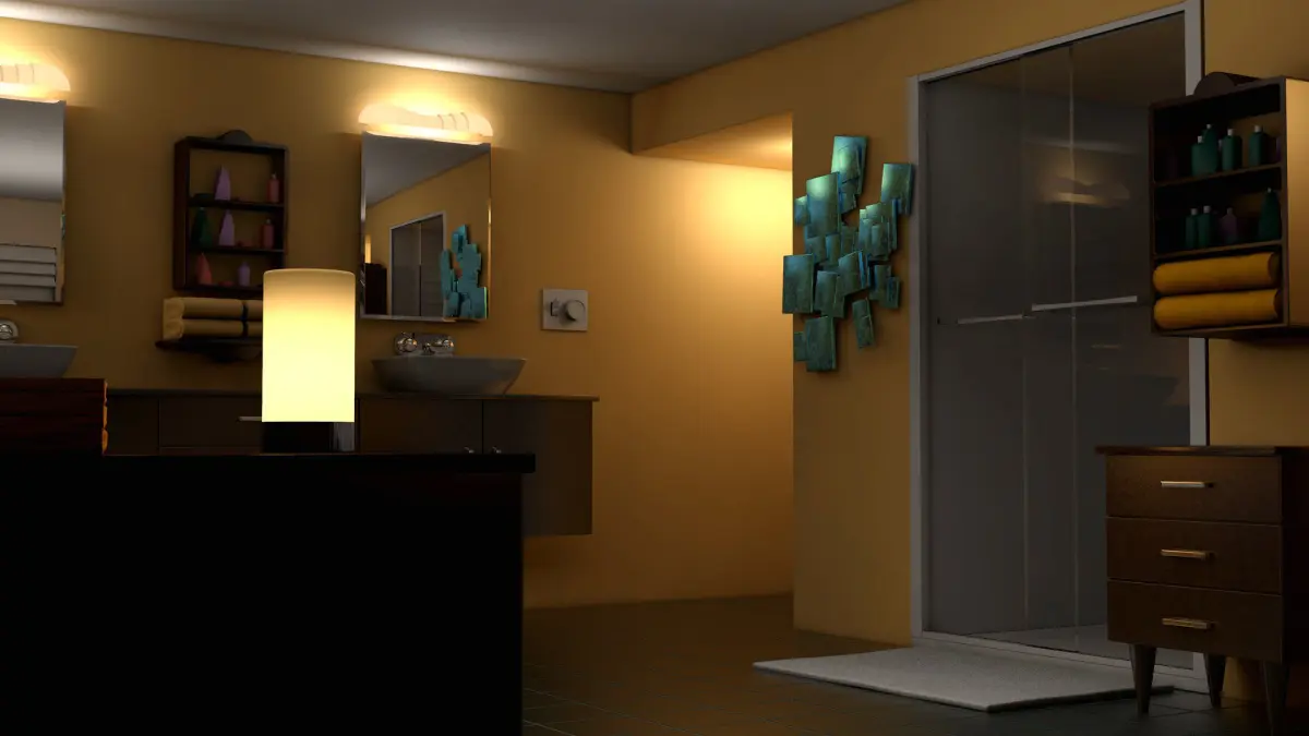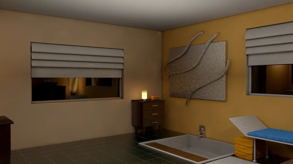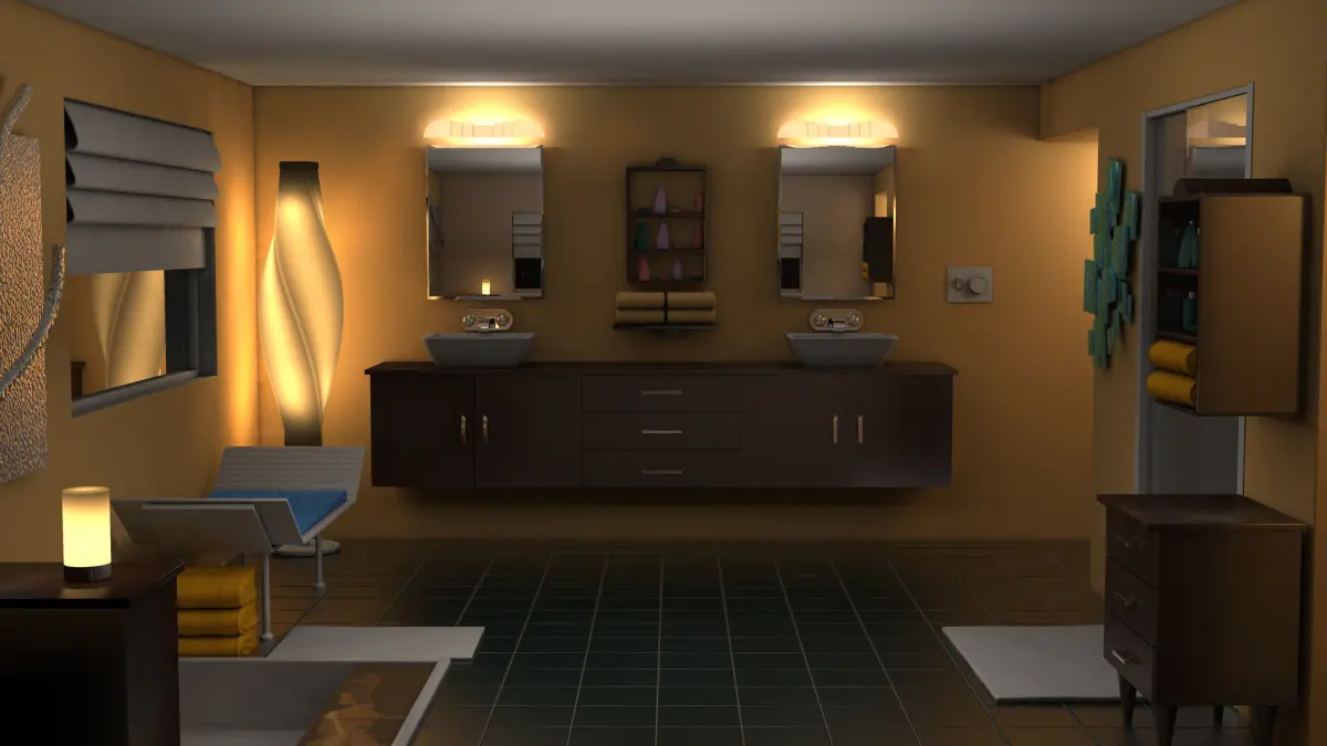 Bathroom Interior.Great for interior visualization.Ready to drop into scene.Real world scale.Clean polygon mesh.Modeled and rendered in Cinema 4D.High – Medium Polygon.Cinema 4D Procedural materials included.Texture files included.Exported Formats: FBX, 3DS, OBJ, DAE.
