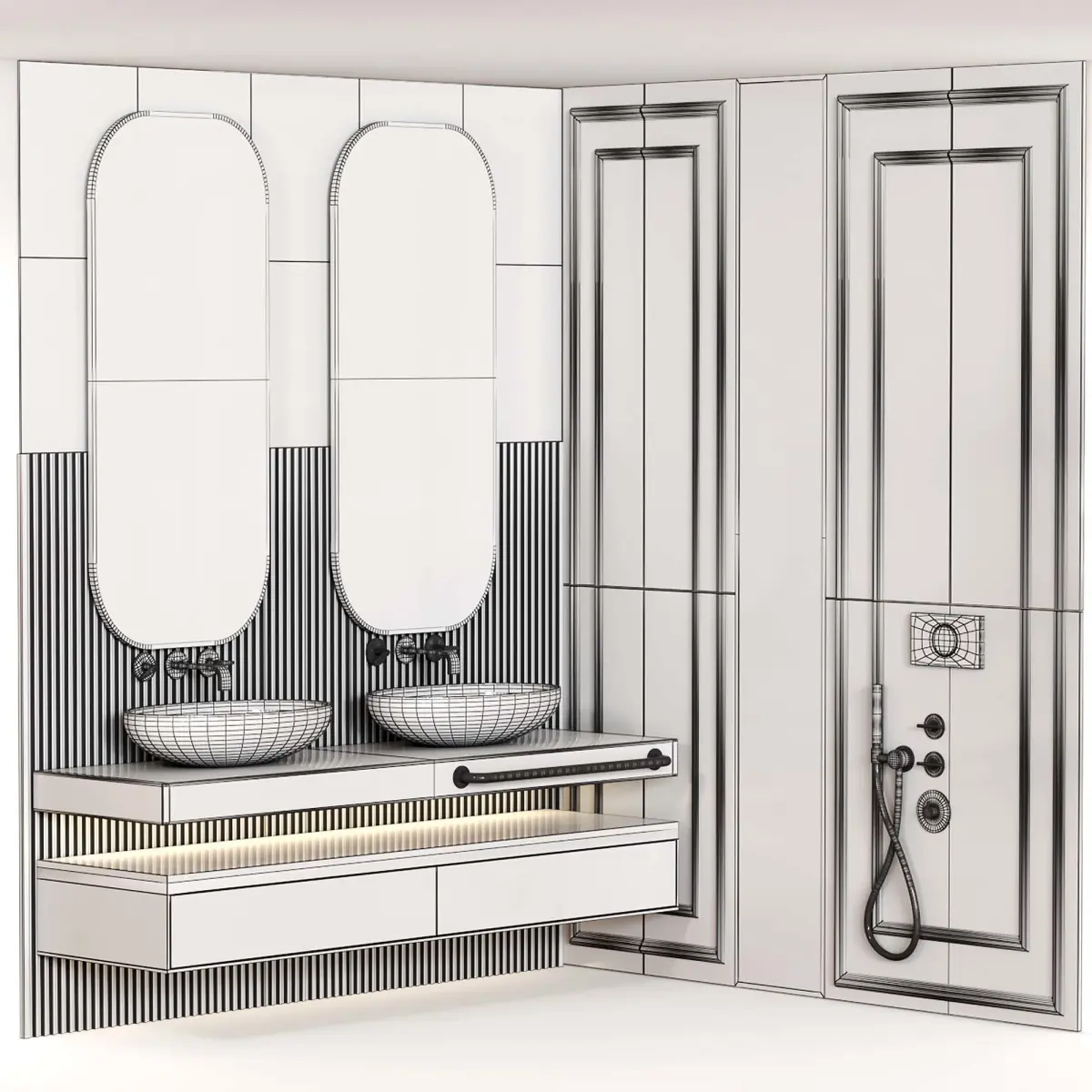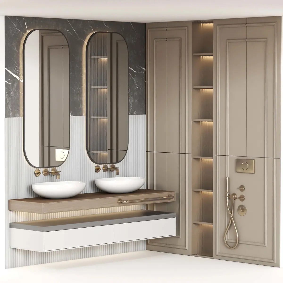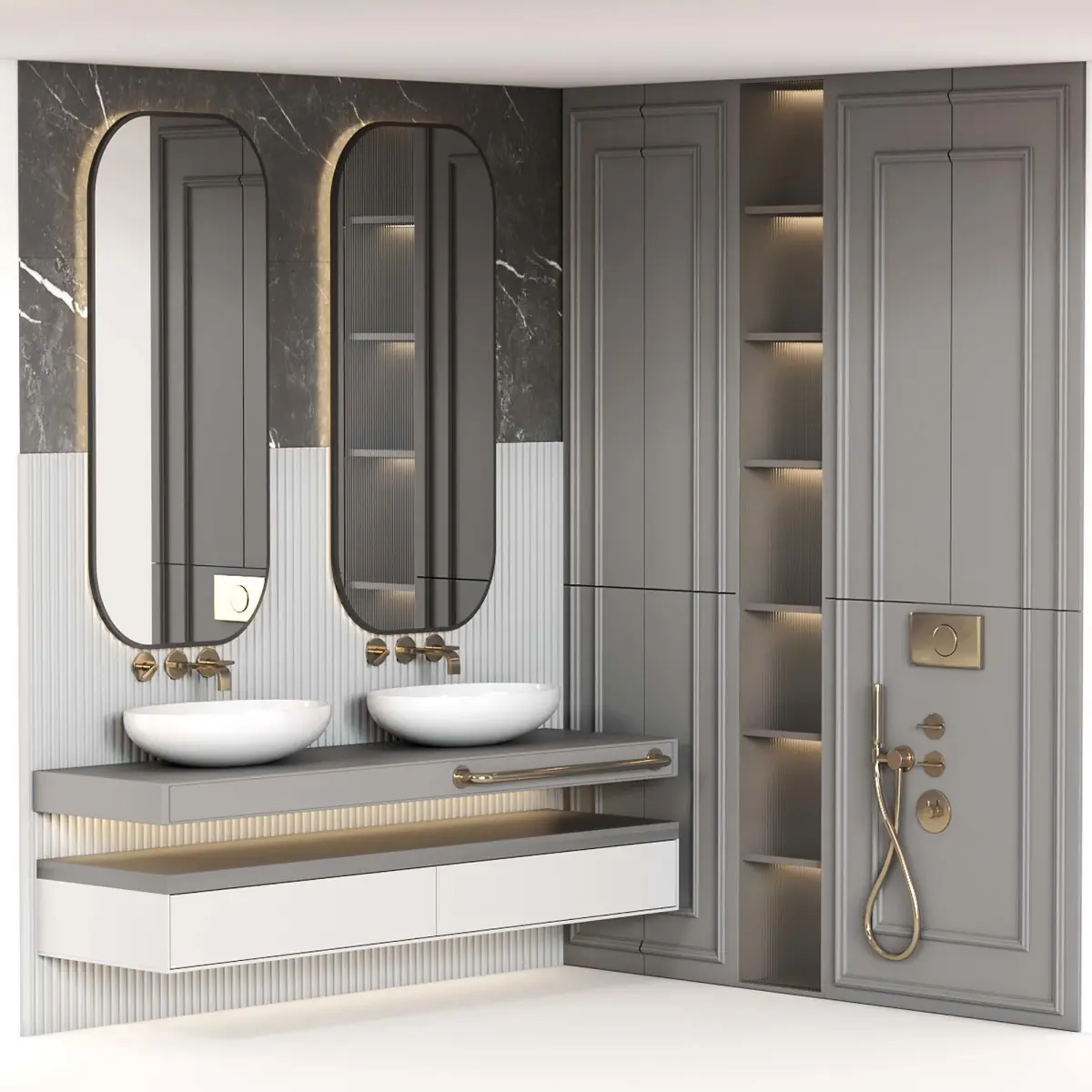 Name: Bathroom furniture N009 in Neoclassic style———————————————3 color from collection, You just need to select the material and connect it to the body color of the poly object.———————————————3Dsmax 2013 (Vray + Corona) + OBJUnits: CentimetersPolys: 57213Verts: 59027———————————————Corner furniture composition for toilet and bathroom:Suitable for interiors: Scandinavian, minimalism, Japandi, wabi-sabi