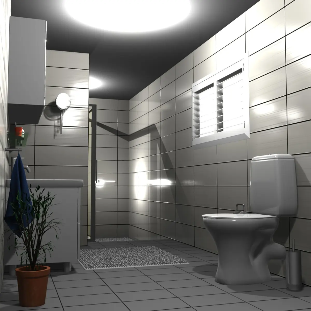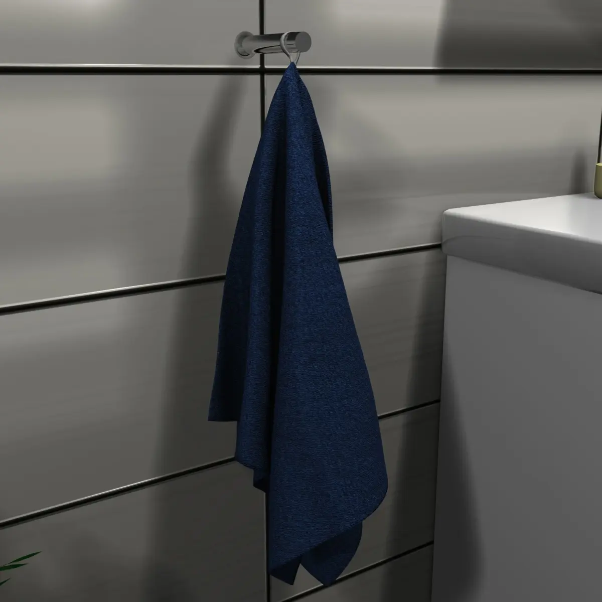 Textures (diffuse, normal, roughness) included for towel, walls, floor, and the plant.