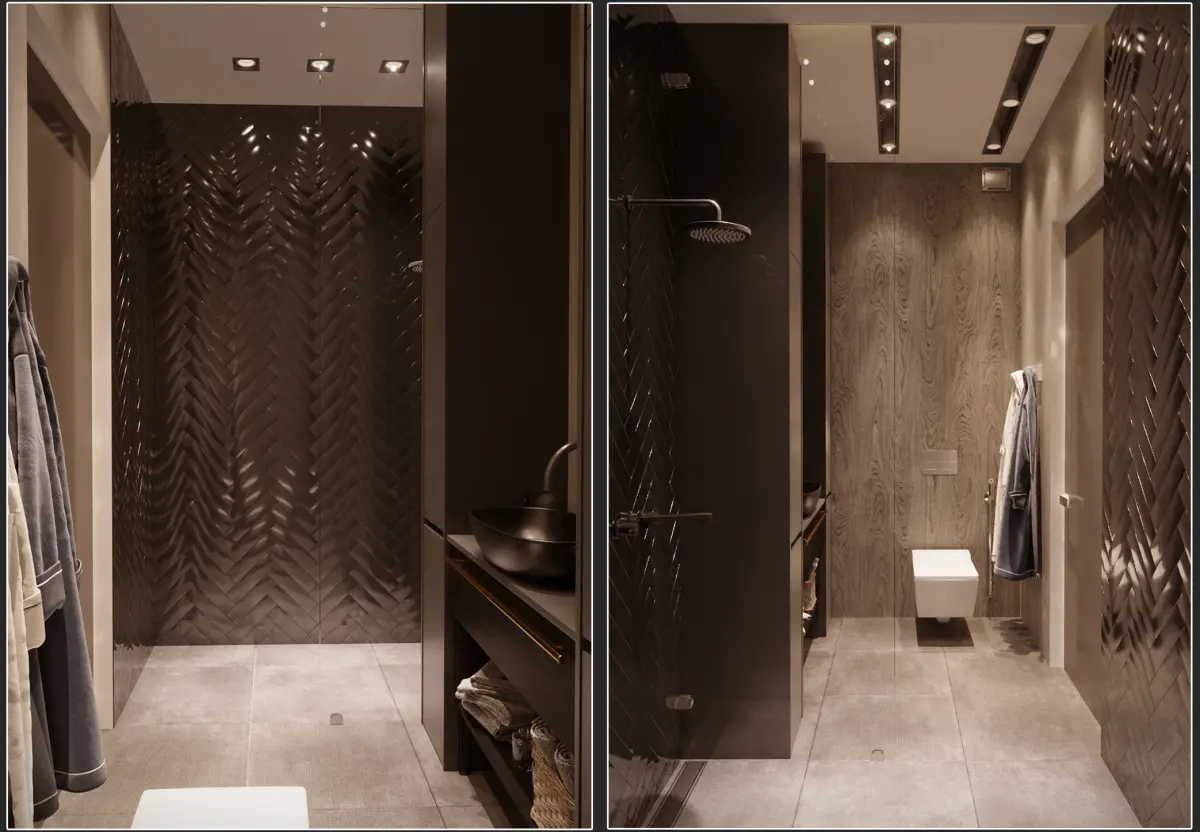 Interior of a bathroom.Created by its own design.All lighting and all materials are configured.Furniture in this interior to order. Elements of lighting, plumbing and tiles are modeled according to the originals.The visualization is done in the Corona renderer.Enjoy with pleasure)