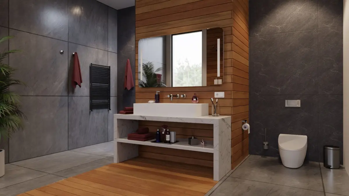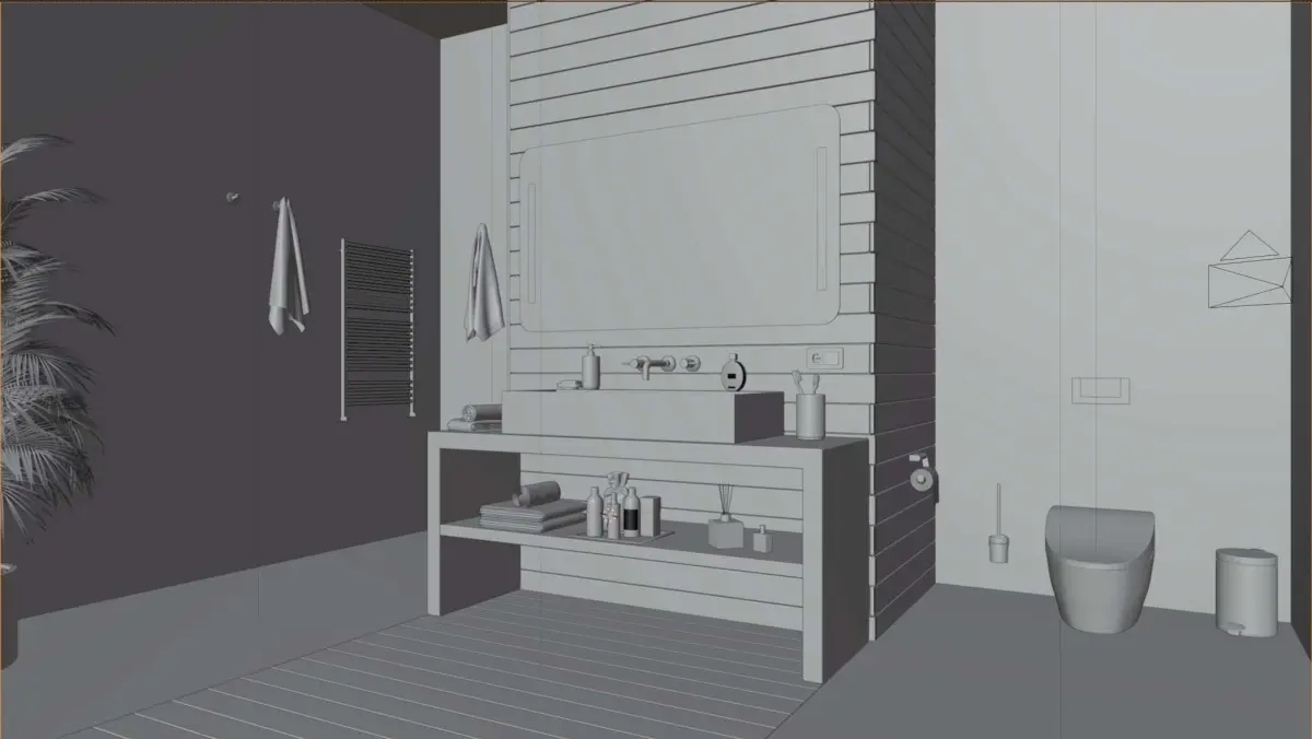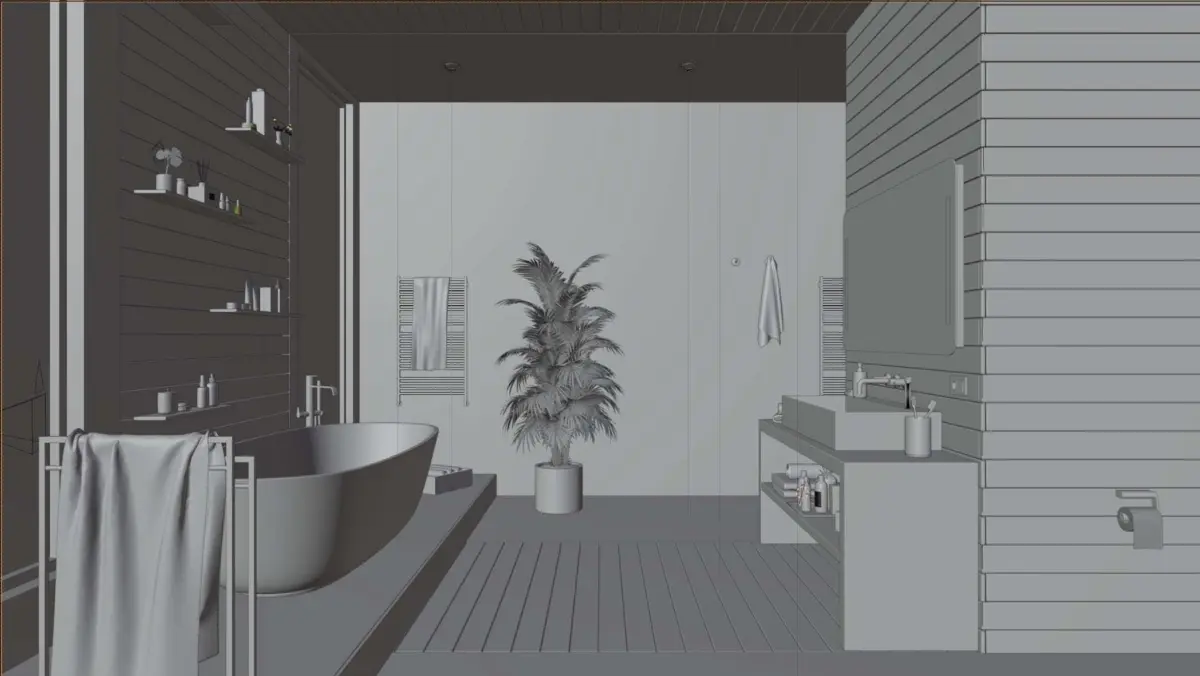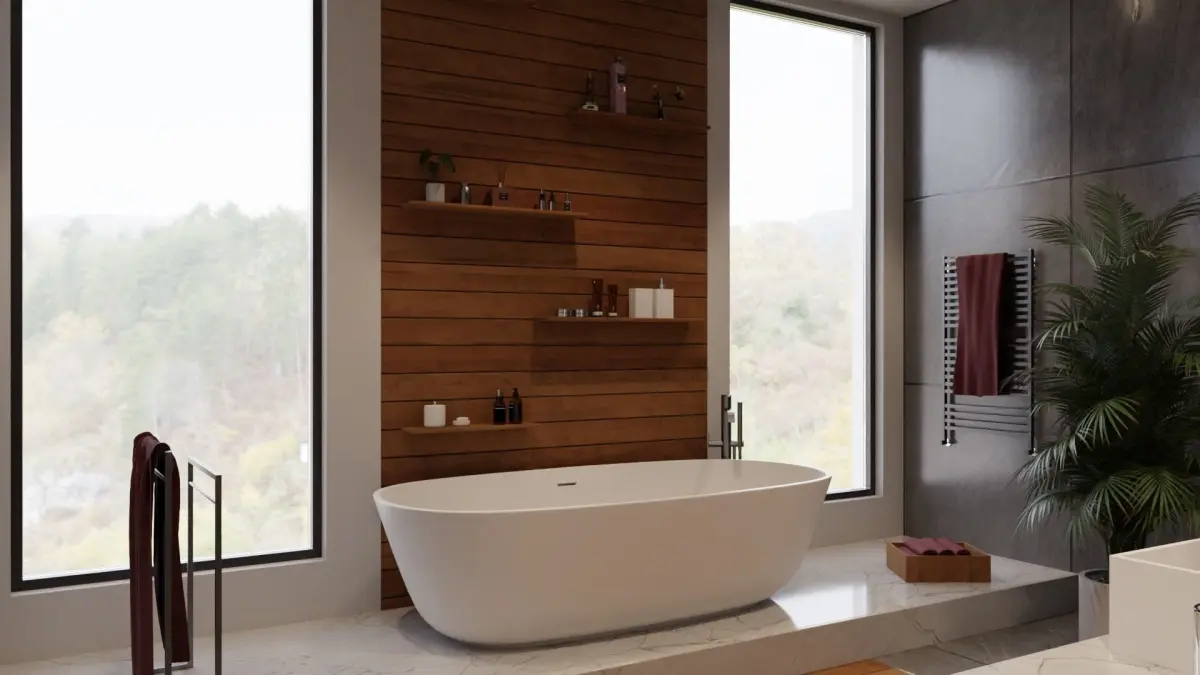 Bathroom accessories and fixtures (Bathtub, sink, faucets, shower head, towels, radiators, mirror, shampoo bottles, plants, etc.)