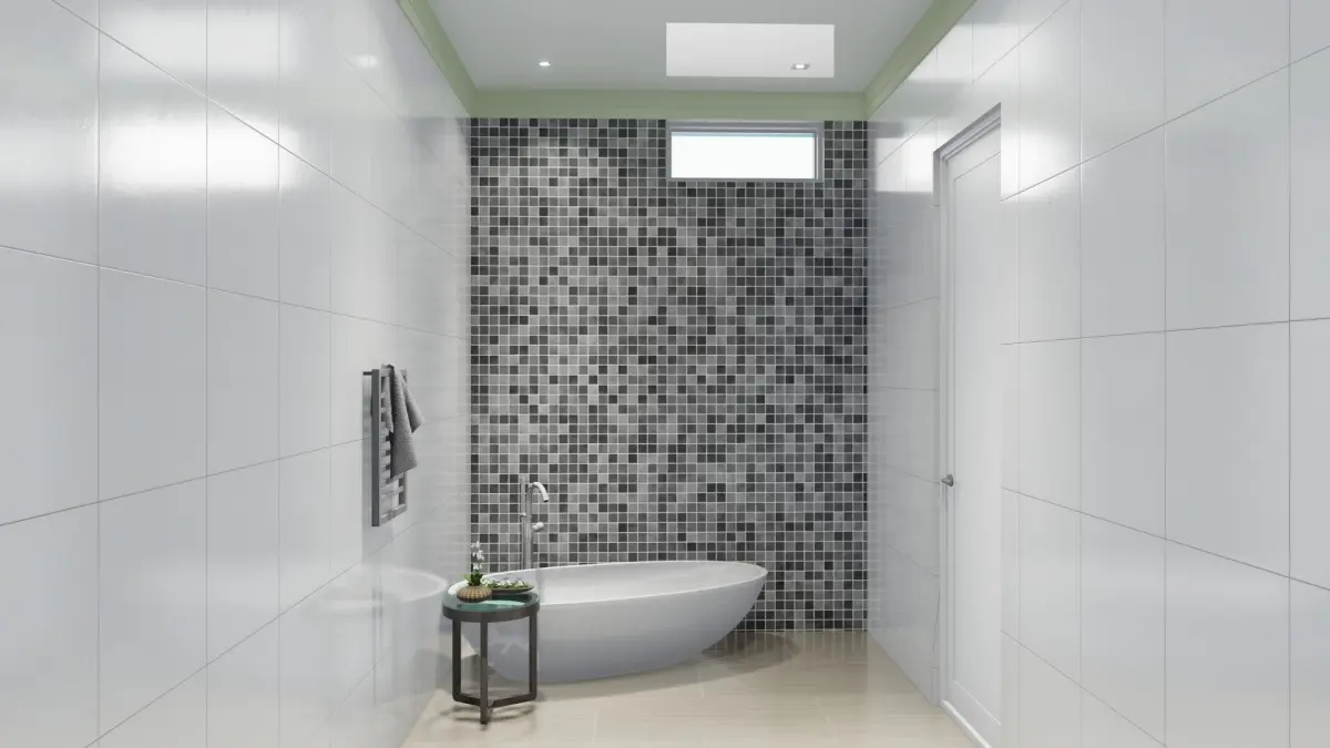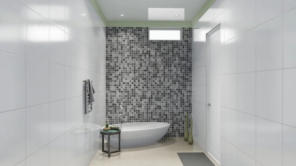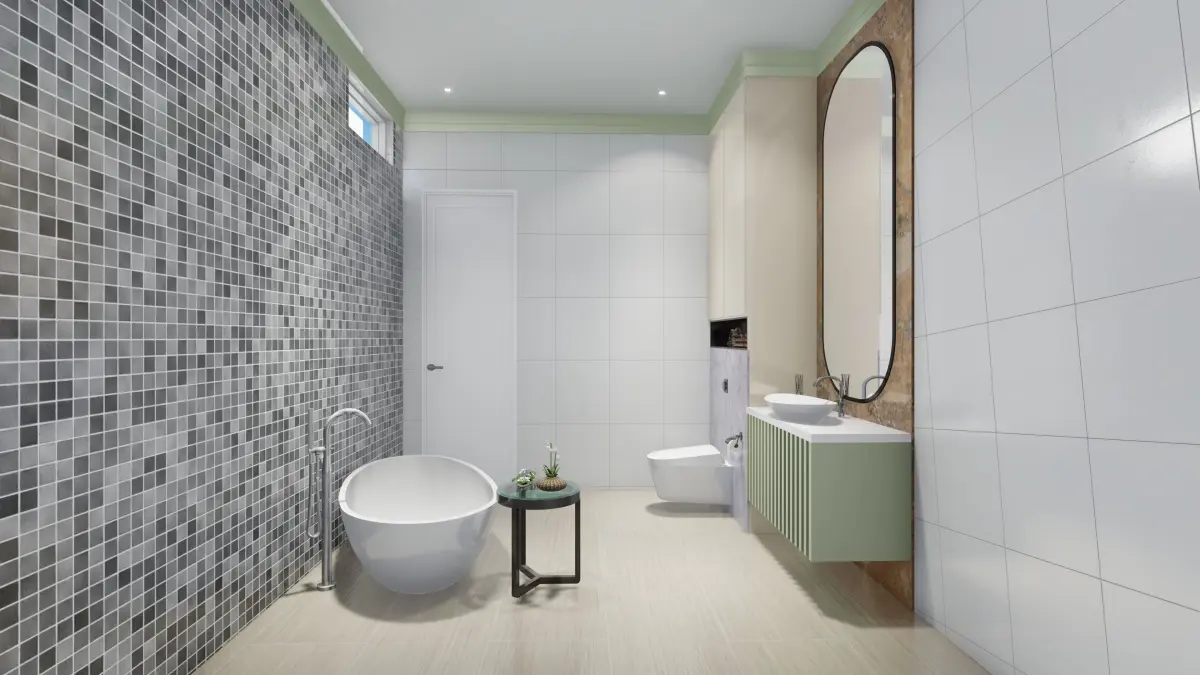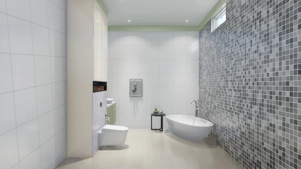 This beautiful conceptual bathroom contains one bathtub and wardrobe for clothing. one washbasin with a cupboard below.