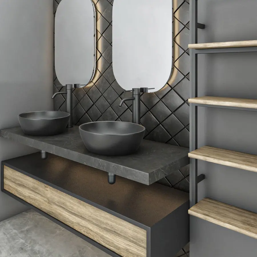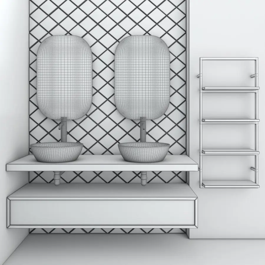 bathroom set 15 consist of mirrors , marble walls , sink and faucets , wood shelves and wood cabinets