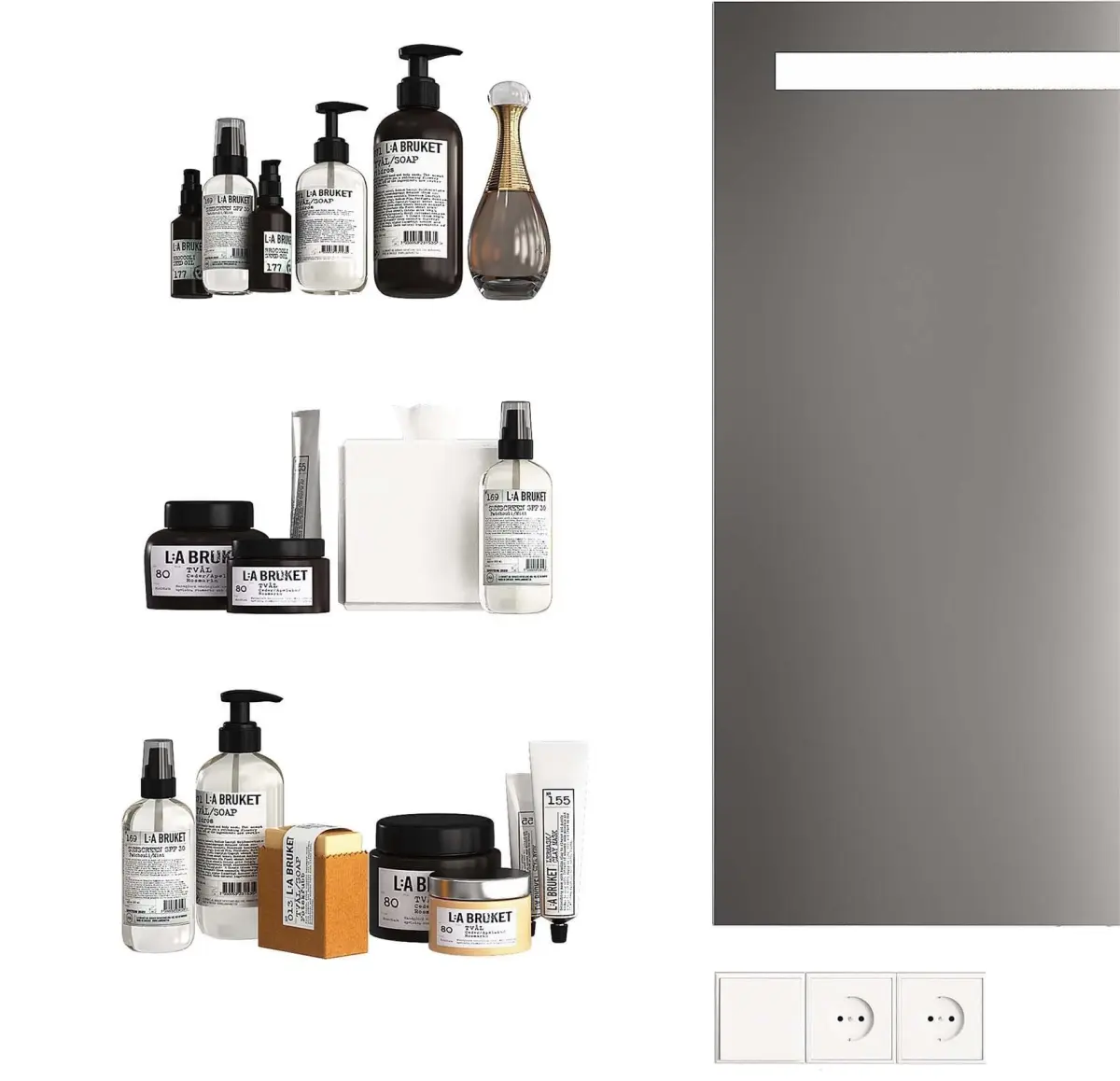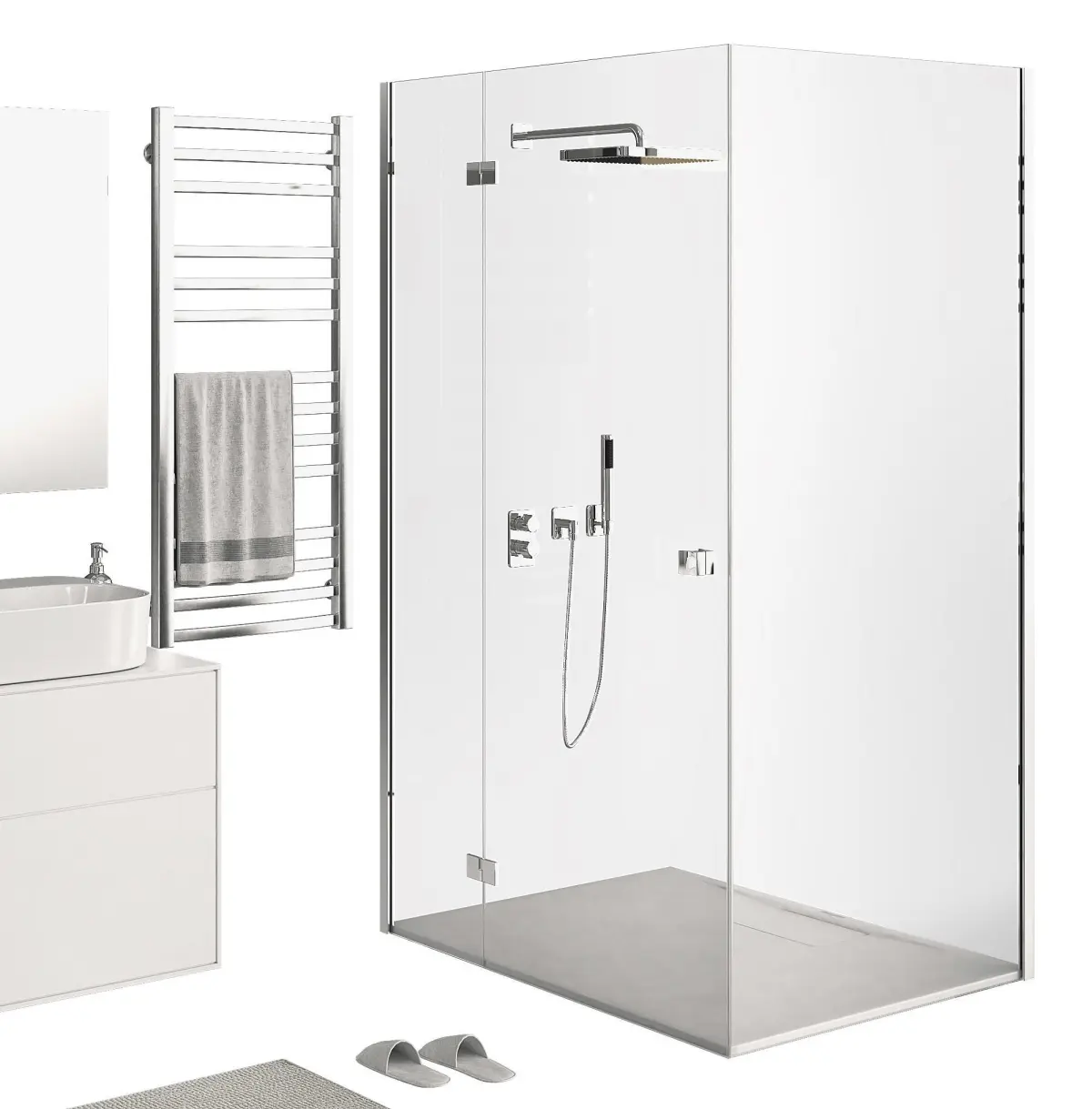 The first part of the universal set of elements for visualizing the bathroom.Villeroy Boch FinionVilleroy Boch JustDecor, sockets, cosmetics and towels2 variants of a shower cabin