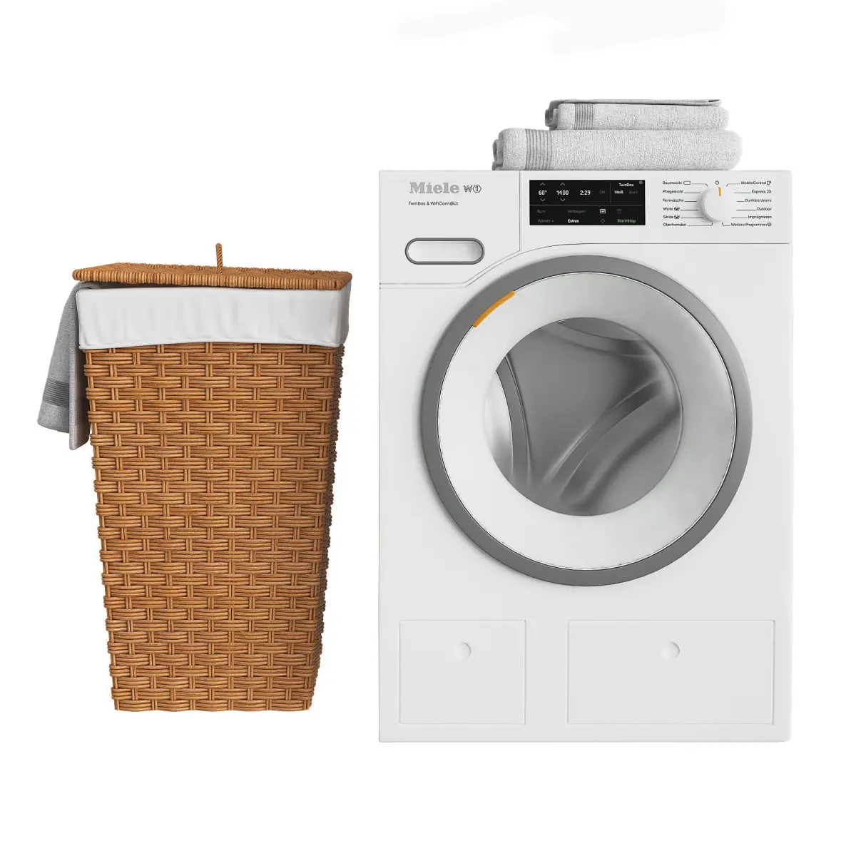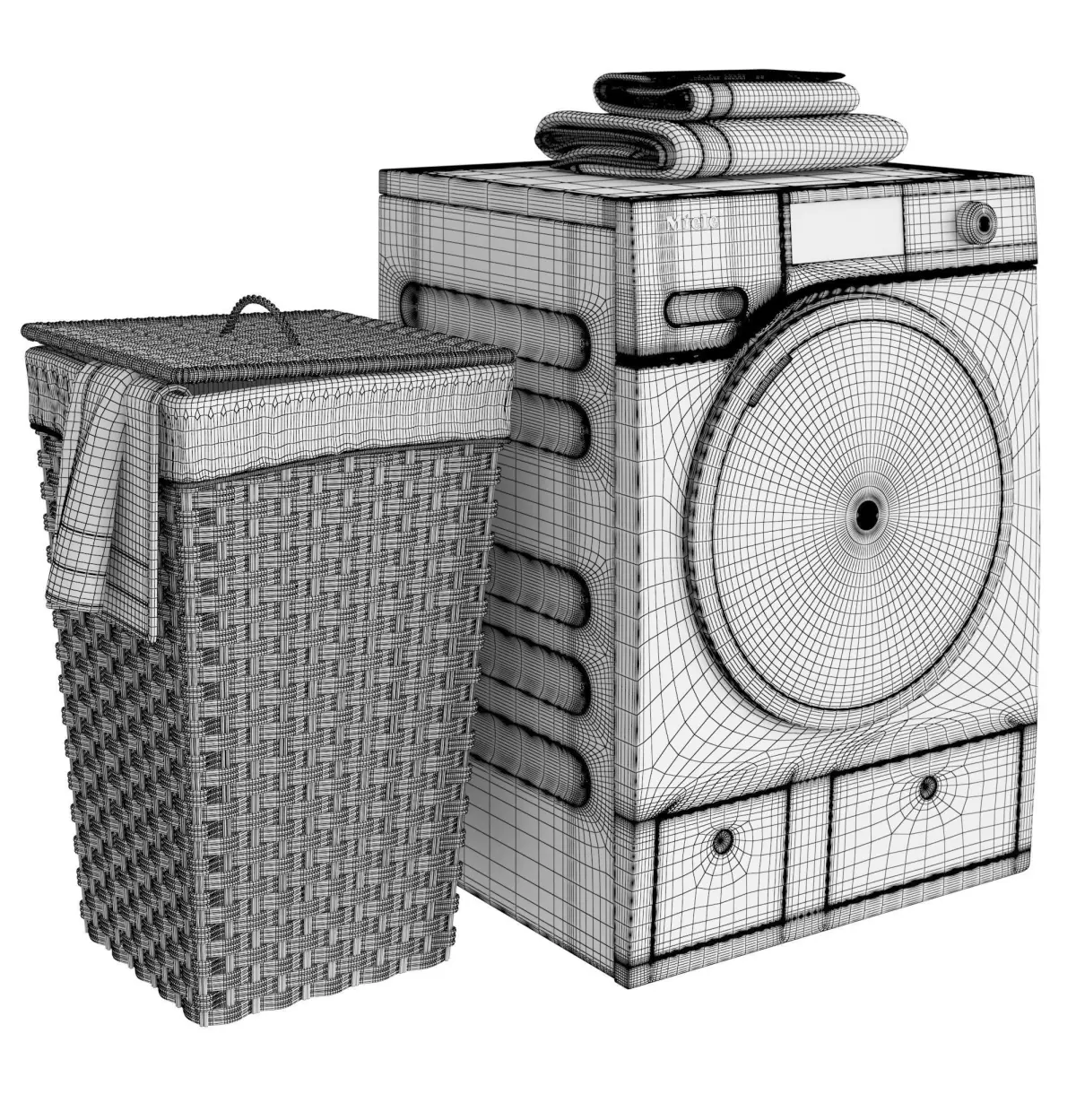 The third part of the universal set of elements for visualizing the bathroom.Washing machine Miele WMF 121Basket and towel