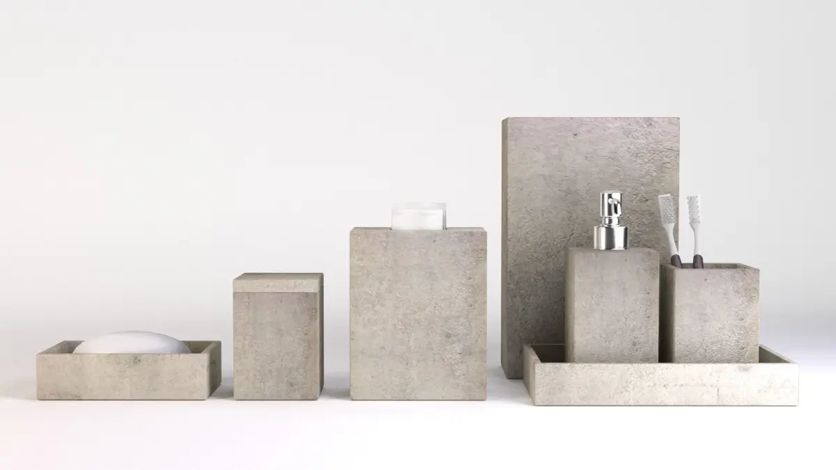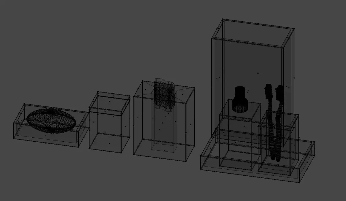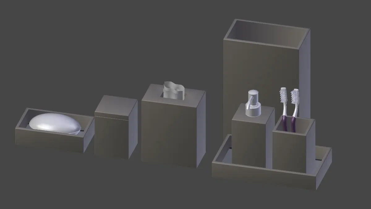 - 10 Models (Soap dispenser + tray, Toothbrushes + holders, Dove soap+ tray, Tissue holder, + more decorative boxes, same as the pictures).-3DS, FBX, OBJ, and Collada file format-TEXTURES (High Quality Concrete texture+ NORMAL map, Soap texture and Tissue paper texture.-Rendered images