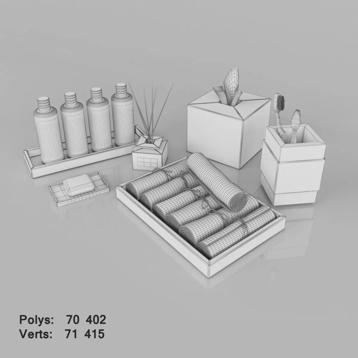 Bathroom set Yves rocher,realistic 3d model for closeup renders created with 3ds max 2012____________________________________________Real world size____________________________________________Model resolutions are optimized for polygon efficiency____________________________________________No cleaning up necessary____________________________________________No special plugin needed to open scene____________________________________________