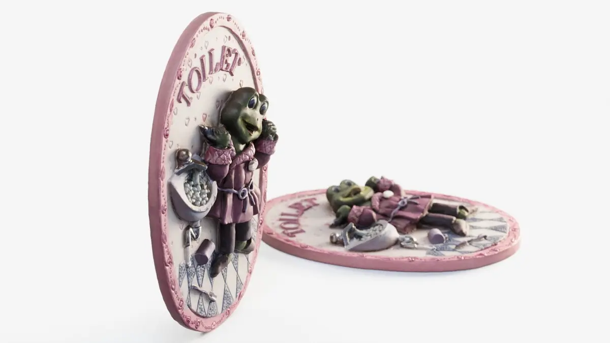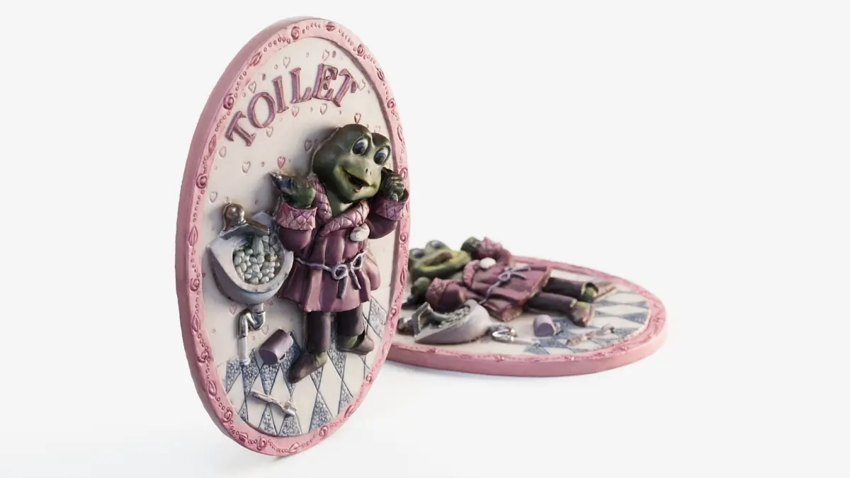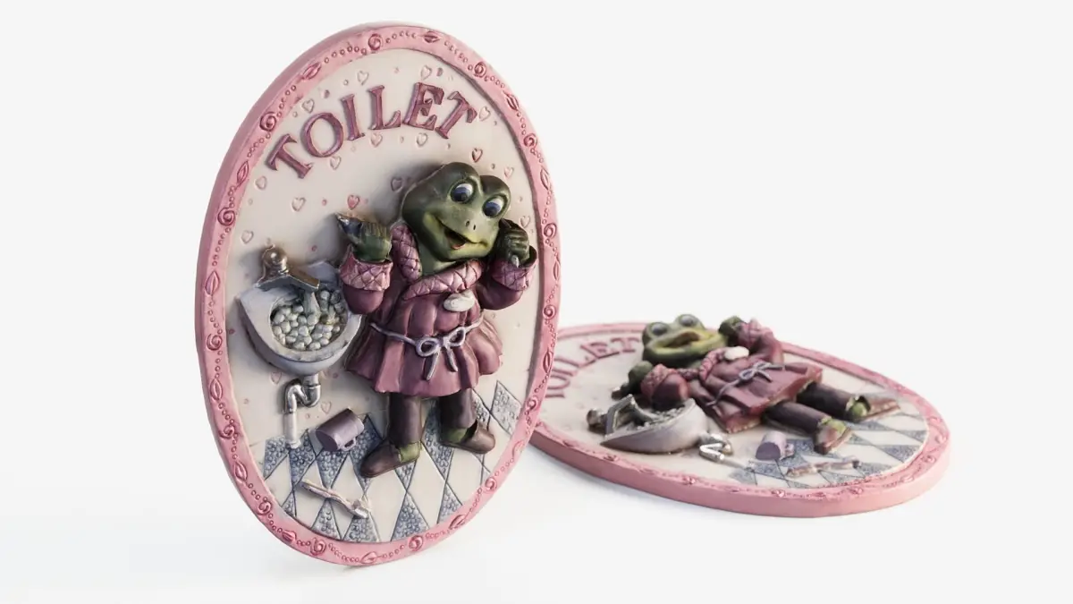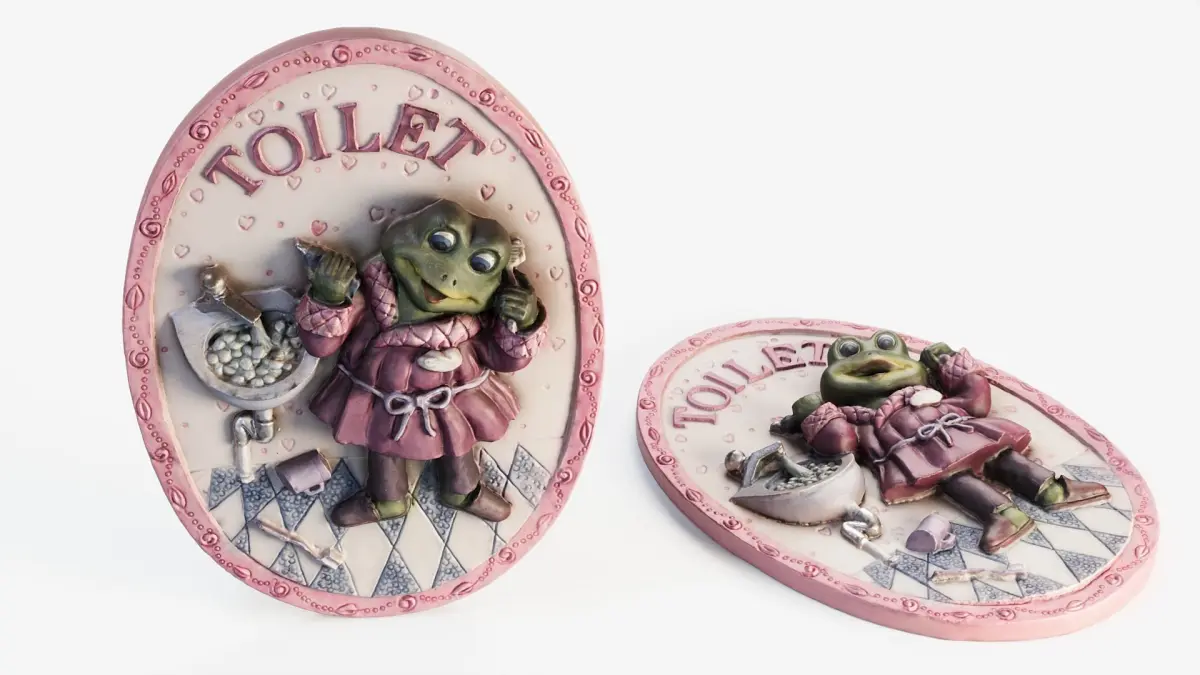 Digital 3D model of small ceramic bathroom home decor sign. The model was created by scanning real object, then carefully cleaning scan data and authoring PBR materials.