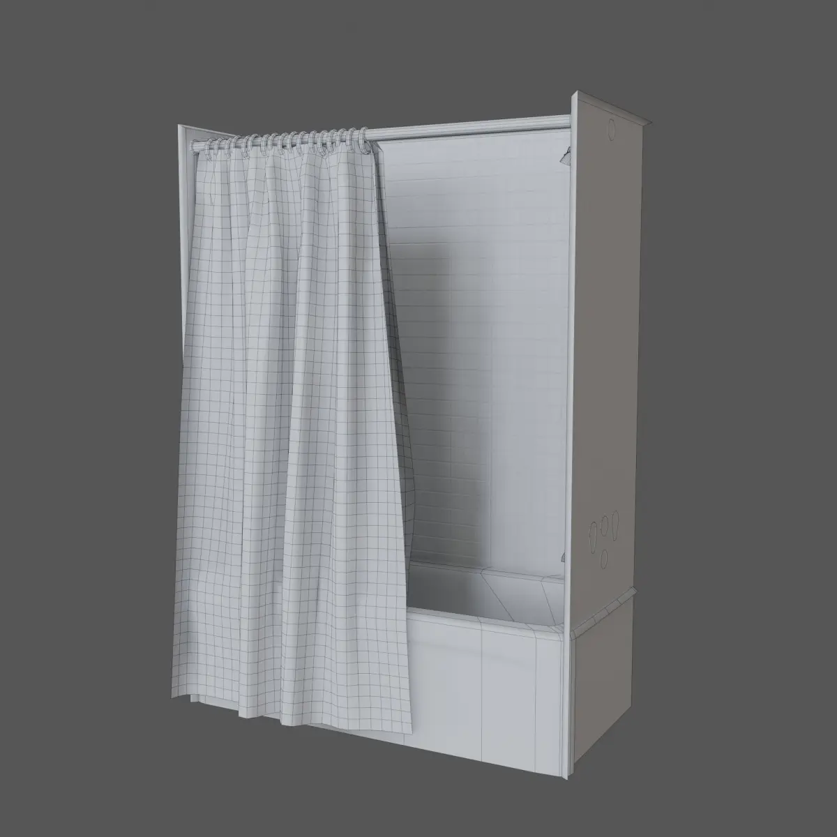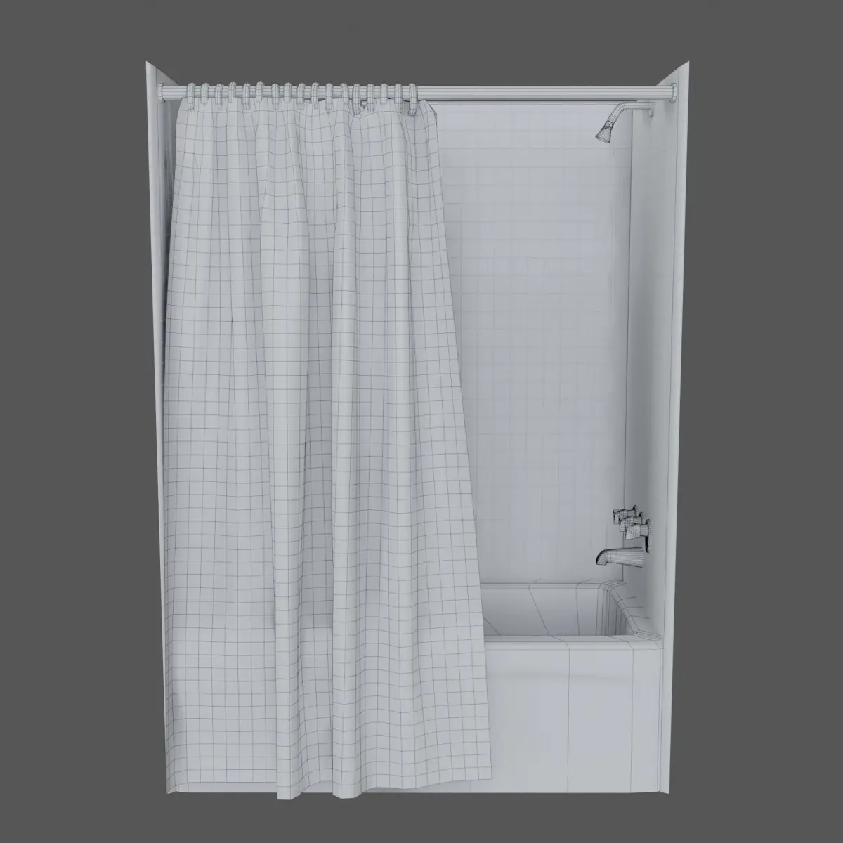 Bathtub, water faucet, shower head, shower curtain, and tiled wall ready to drop into an existing room. Faucet handles and shower head are separate objects for simple manipulation. Be sure to render both sides of the shower curtains or flip the normals to face the appropriate direction for your scene.