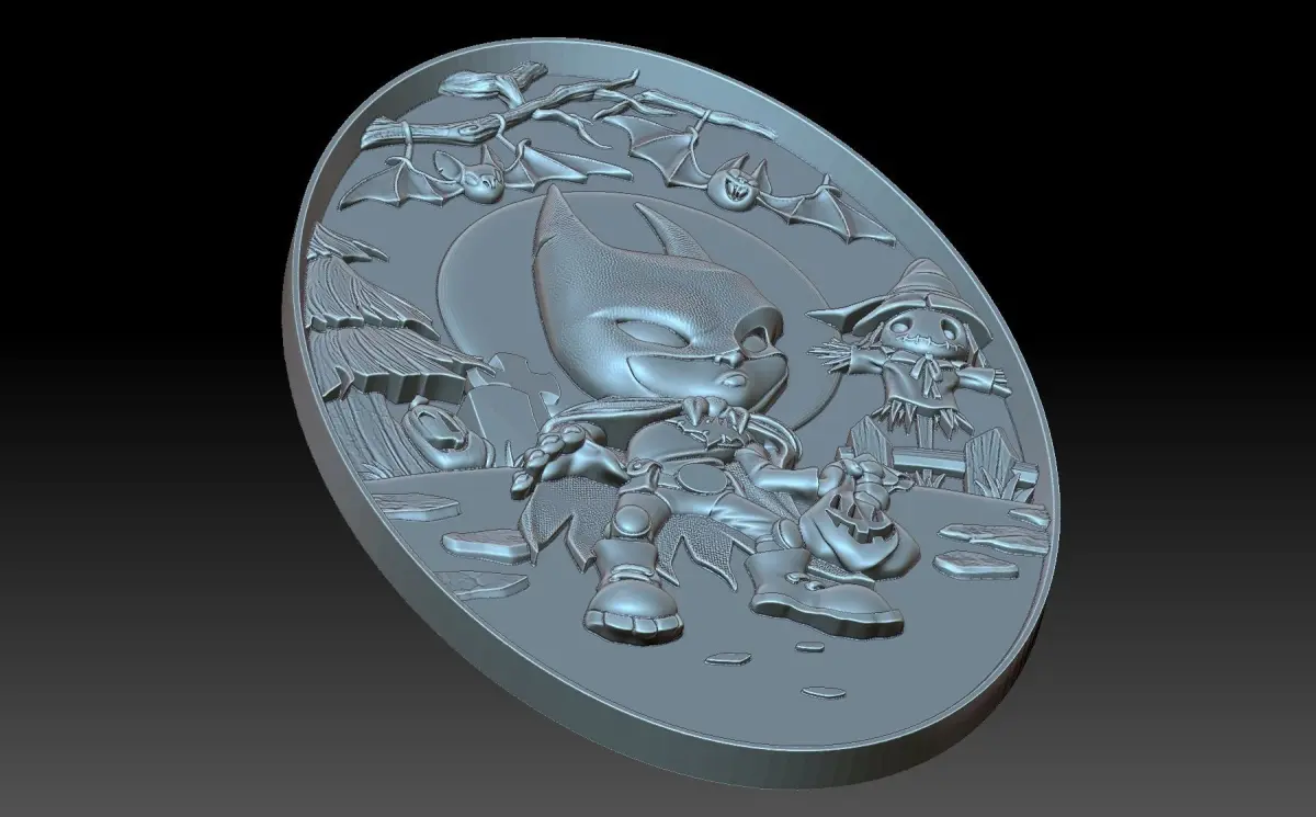 A bas-relief of Batman in a cartoon performance, an interesting, dynamic composition with the presence of various attributes of the Halloween holiday, which makes the composition easily perceived and interesting to consider.