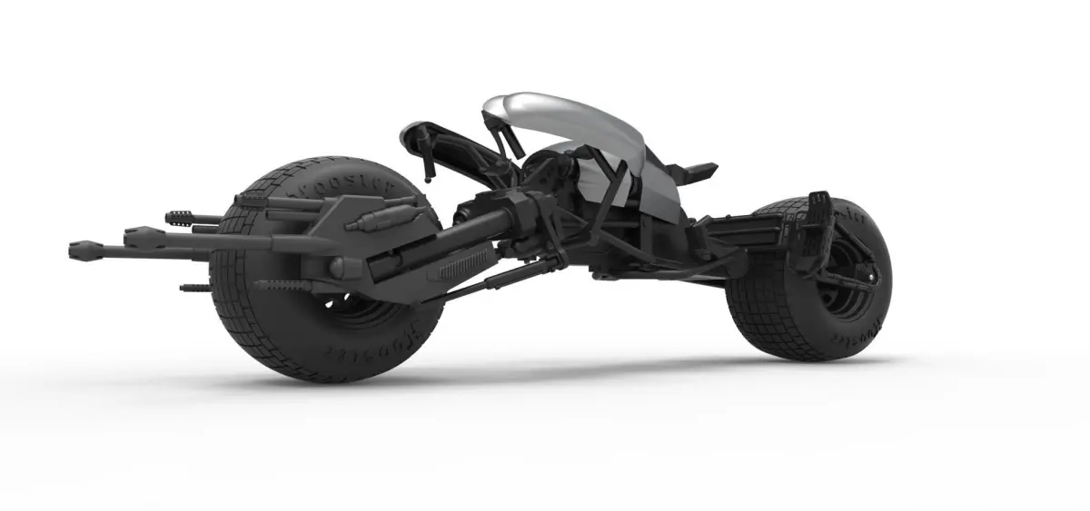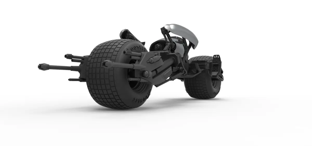 The Batcycle is known as the Batpod for The Dark Knight and The Dark Knight Rises The bike has 20" front and rear tires and is powered by a high-performance, water-cooled, single-cylinder engine - geared toward the lower end for faster acceleration and with no exhaust pipes. The exhaust is routed through the hollow steel/aluminum/magnesium tubing used for the frame of the bike. The Batpod is steered by the shoulders instead of hands, and the rider's arms are protected by shields. For the film, the bike is armed with grappling hooks, cannons, and machine guns.
