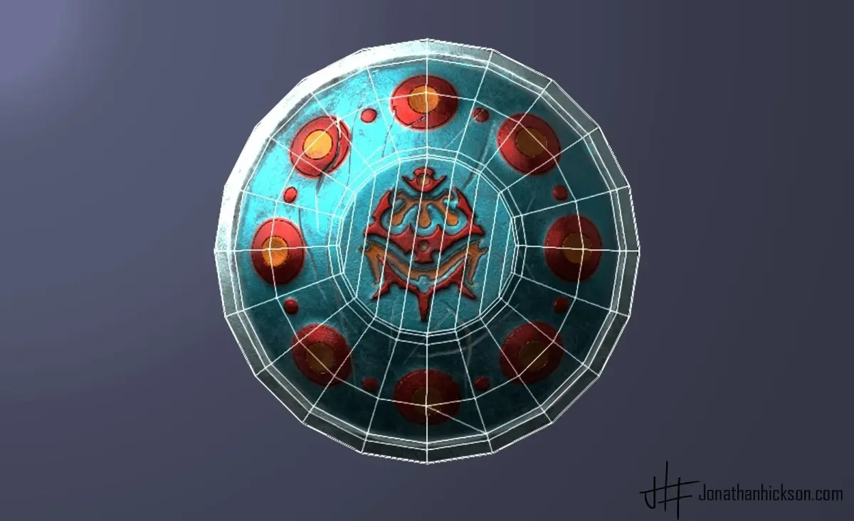A damaged round shield, made of cast iron. Once meant to be purely ornamental, it was picked up in a desperate moment to save a life and then became a trusted side arm for a warrior.
