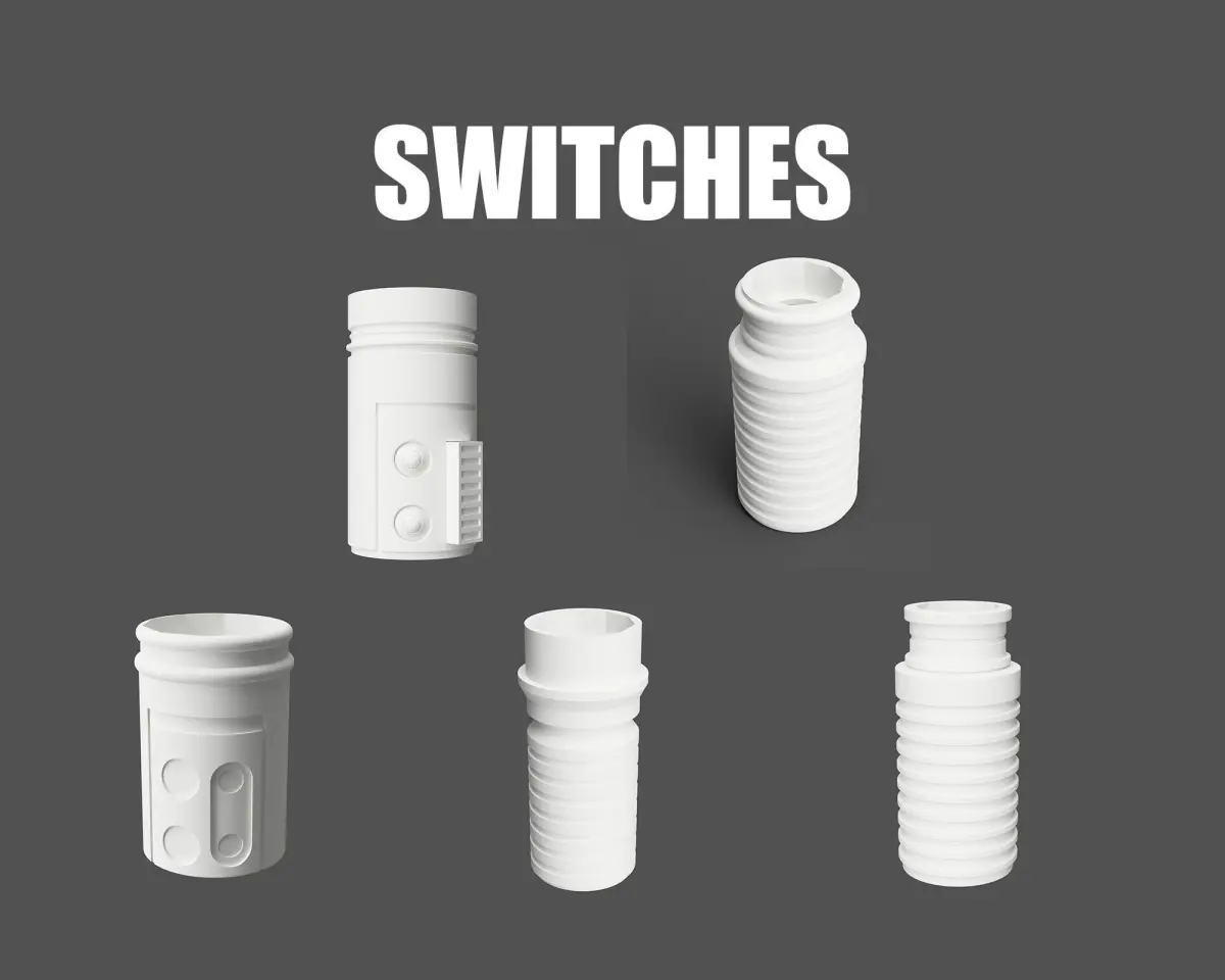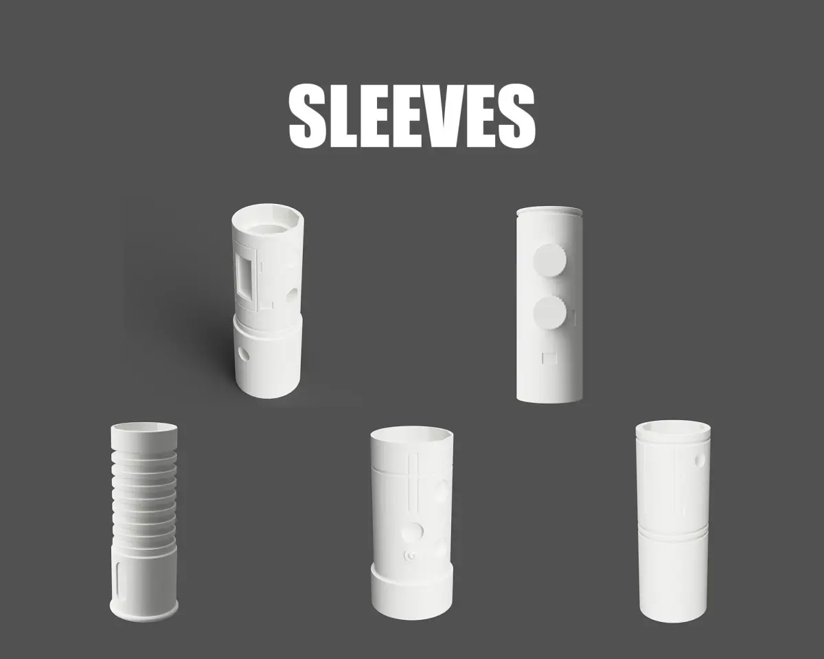 This collection will allow you to make 20 different combinations when you print one of each section type. You may also use sections to create double bladed lightsaber hilts, making the possibilities endless.