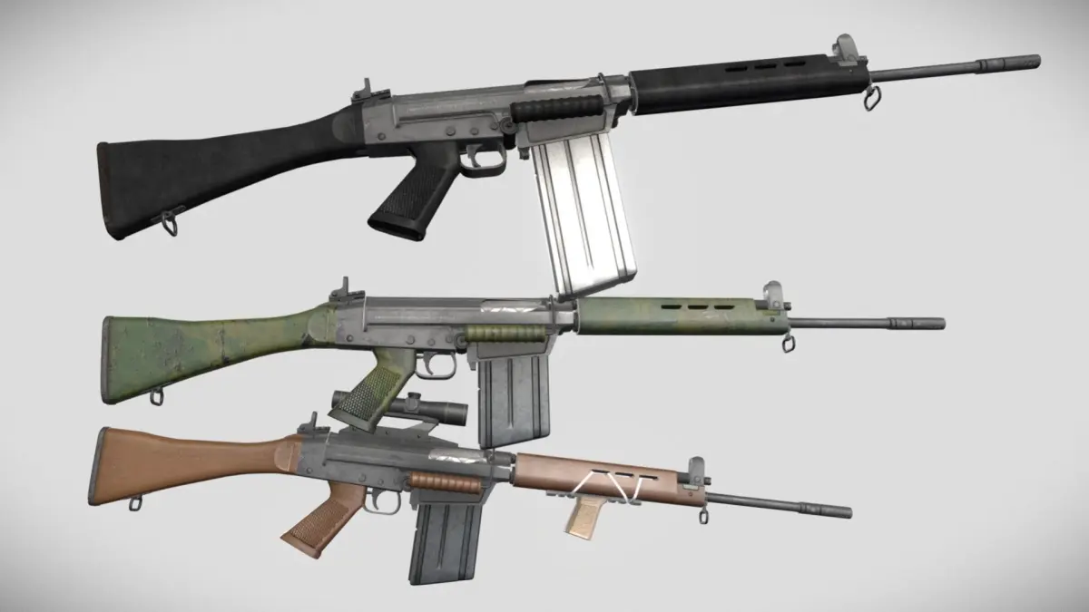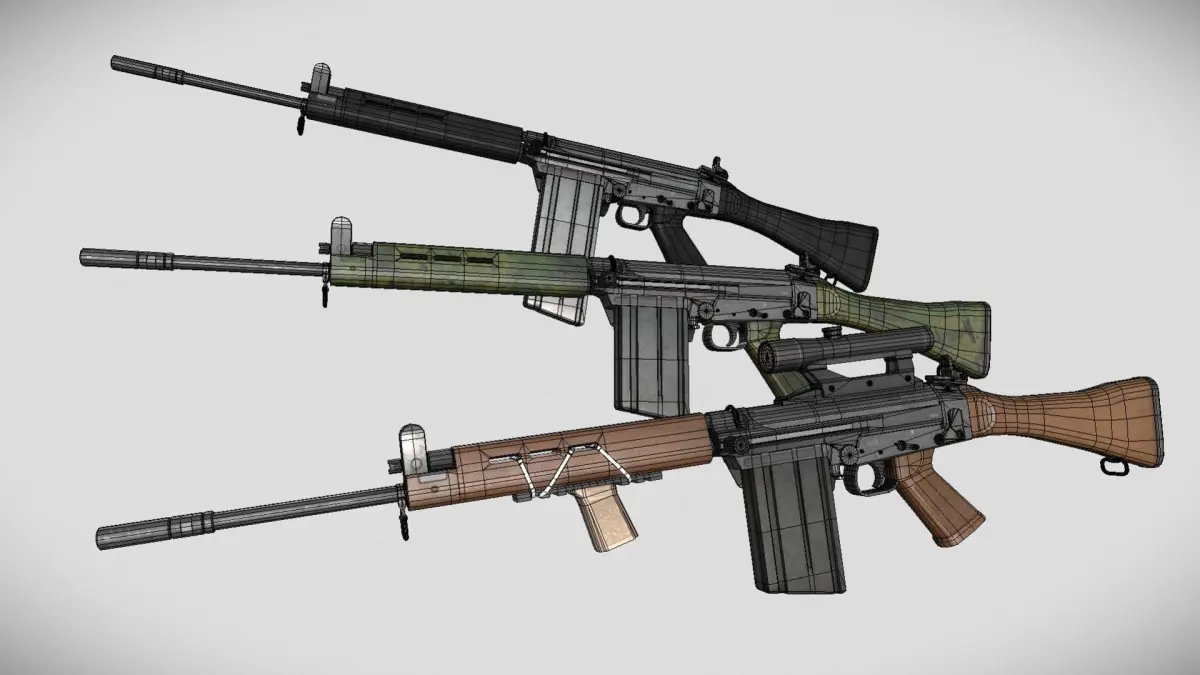 Low poly battle rifle modeled after the FN FAL plus wood, polymer, and Rhodesian baby poop camouflage furniture textures (handguard, pistol grip, buttstock and carry handle), plus a basic scope, 20 round and 30 round mags, and a vertical grip mesh.