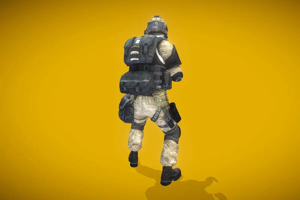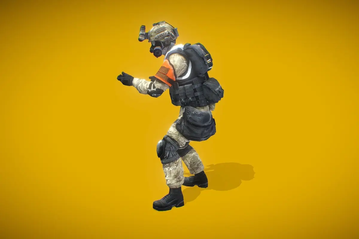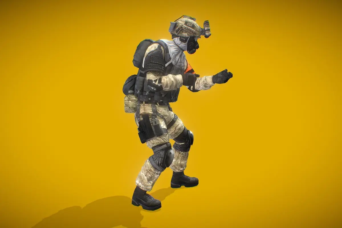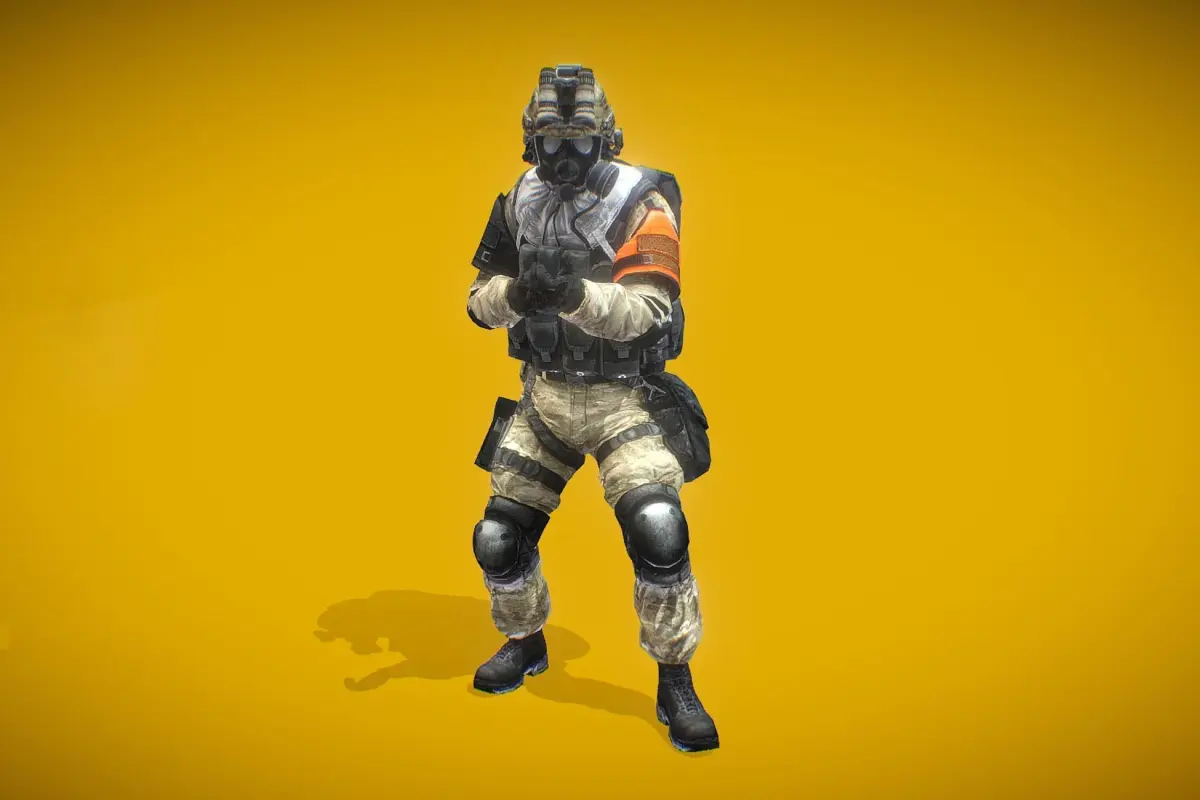 A special forces soldier armed with a rifle and equipped with a gas mask and night vision goggles. Great for your FPS / Battle Royale games.
