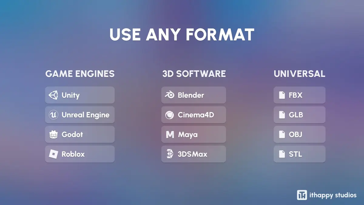 FILESYou’ll be able to download formats such as Unity Package, UE, Blender, C4D, Maya, 3DSMax, FBX, OBJ, GLTF, and STL.