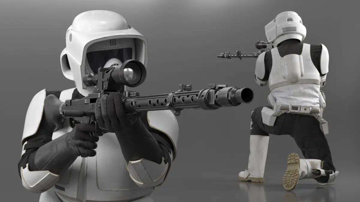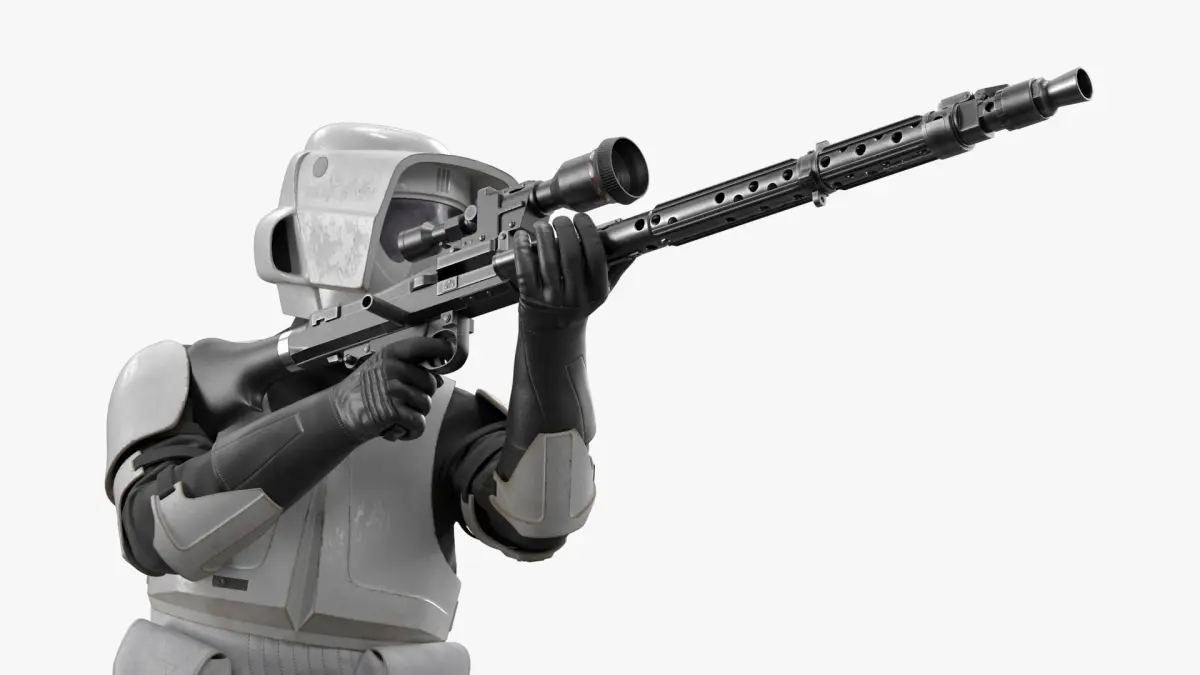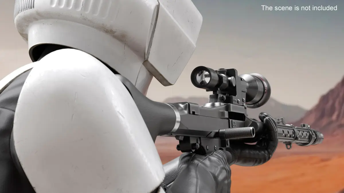 Battle-Worn Star Wars Trooper in Fire Position is a three-dimensional model of futuristic military uniform, recognized for its sleek design and functional features, popular in sci-fi narratives.