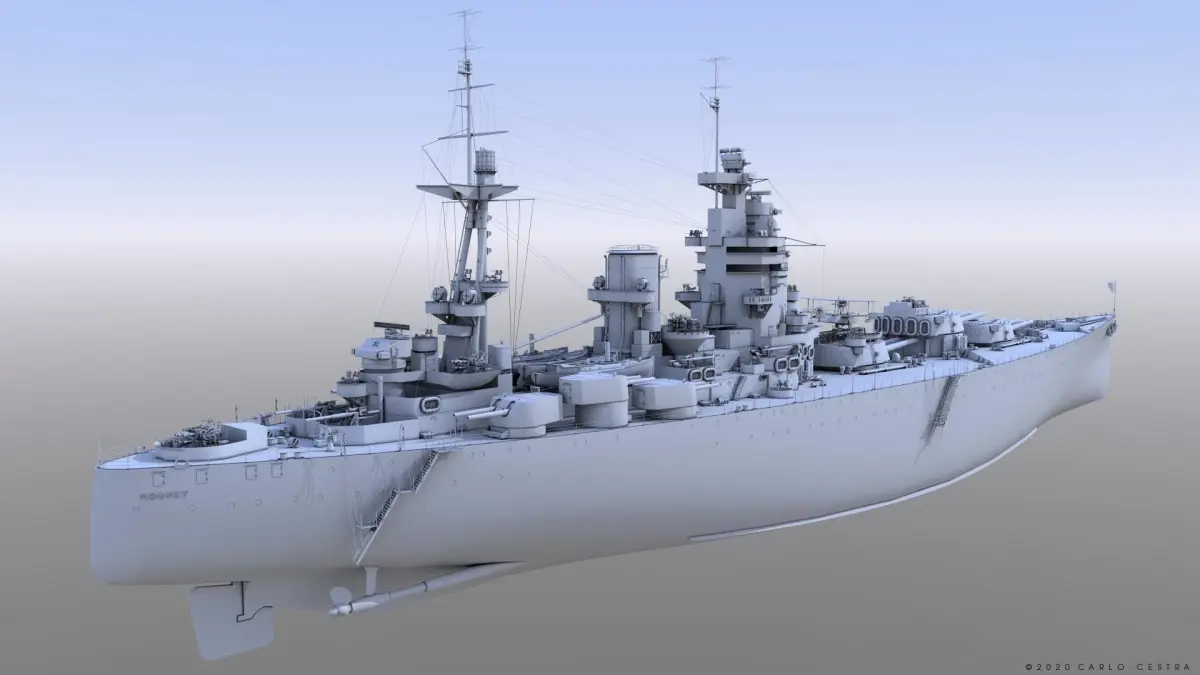 High detailed 3D model of the WW2 British battleship HMS Rodney. She was one of two Nelson-class battleships built for the Royal Navy in the mid-1920s. During the Second World War, she played a major role in the sinking of the German battleship Bismarck in mid-1941.