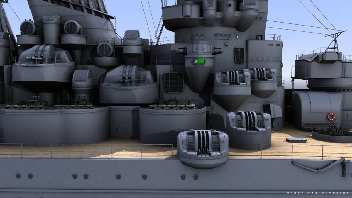 Inside the Lightwave scene there is a basic setup with controls that allows you to animate each element of the ship. You can animate: 1) the rotation, the elevation and the recoil of each gun and armored turret; 2) the rotation of each gun and light tower control; 3) the rotation of each rangefinder; 4) the rotation of each search light; 5) the rotation of propellers and rudders.