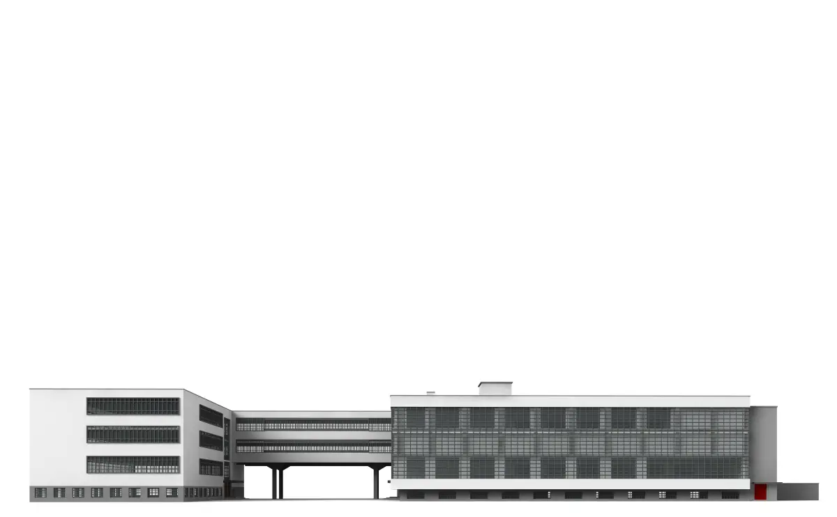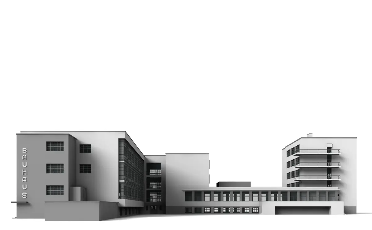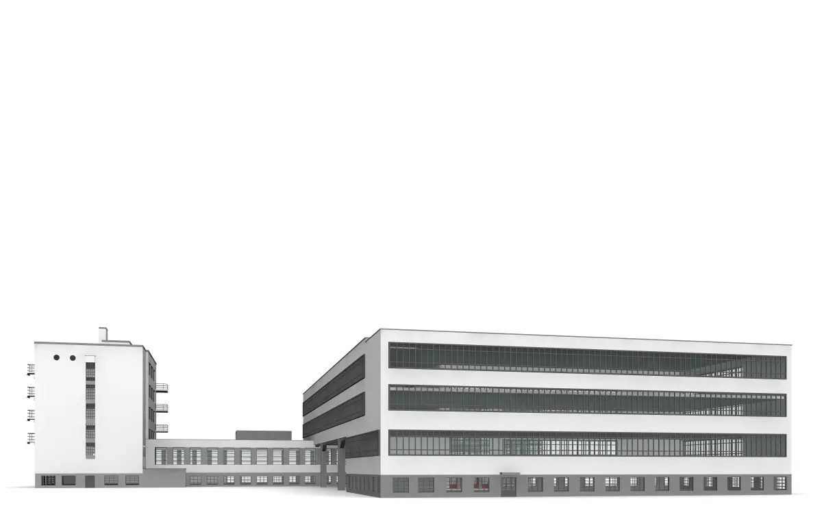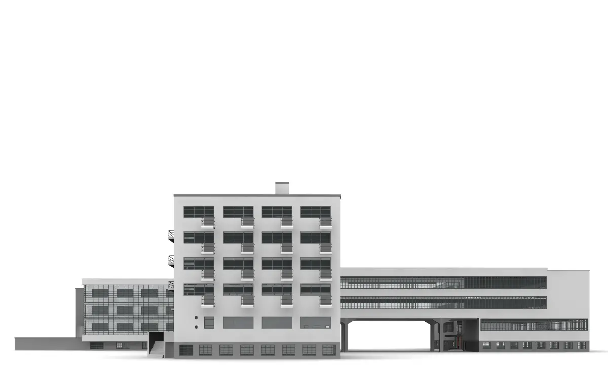 3D model of the Bauhaus Dessau buildingPurchase a downloadable version of one of the finest 3D building models of the 20th century. This is a fine example of modernist architecture from the 1920s. The original Bauhaus building has UNESCO World Heritage status and is situated in the German municipality of Dessau-Roßlau. This large town is famous for this influential school of art, architecture and design which changed current thinking about the design of manufacturing and buildings. This modernist movement sought to marry art with everyday function at a time when products had become soulless and bland. The ideals were to create beautiful objects that were well built, functional and practical.