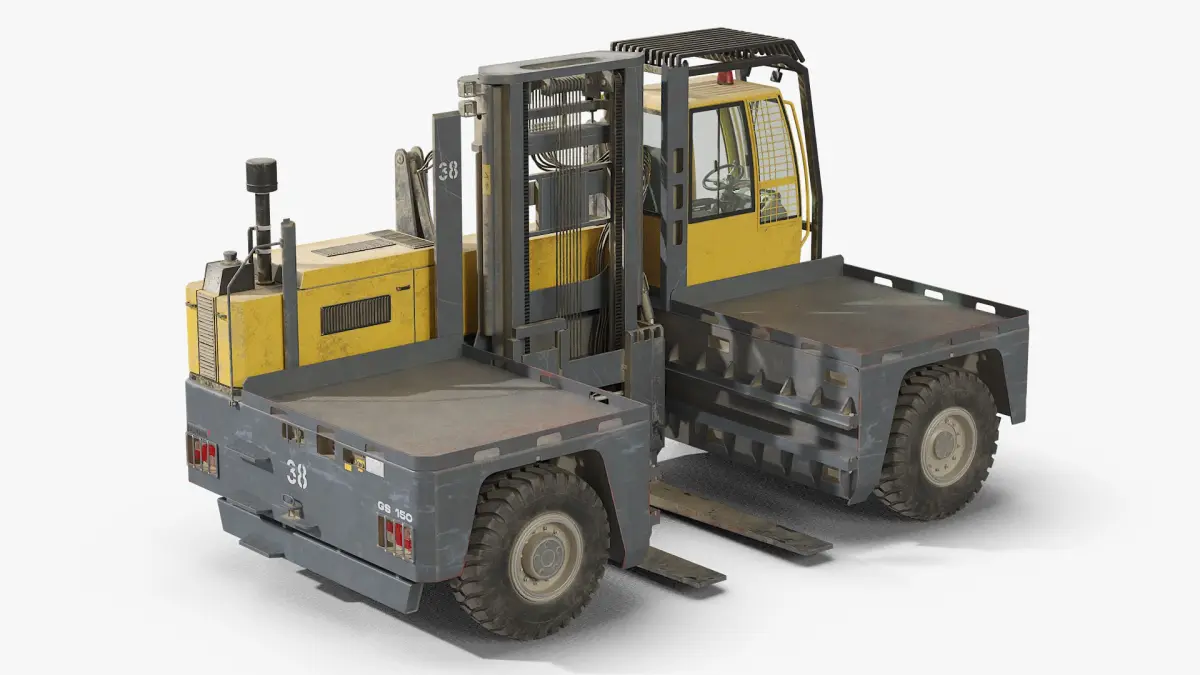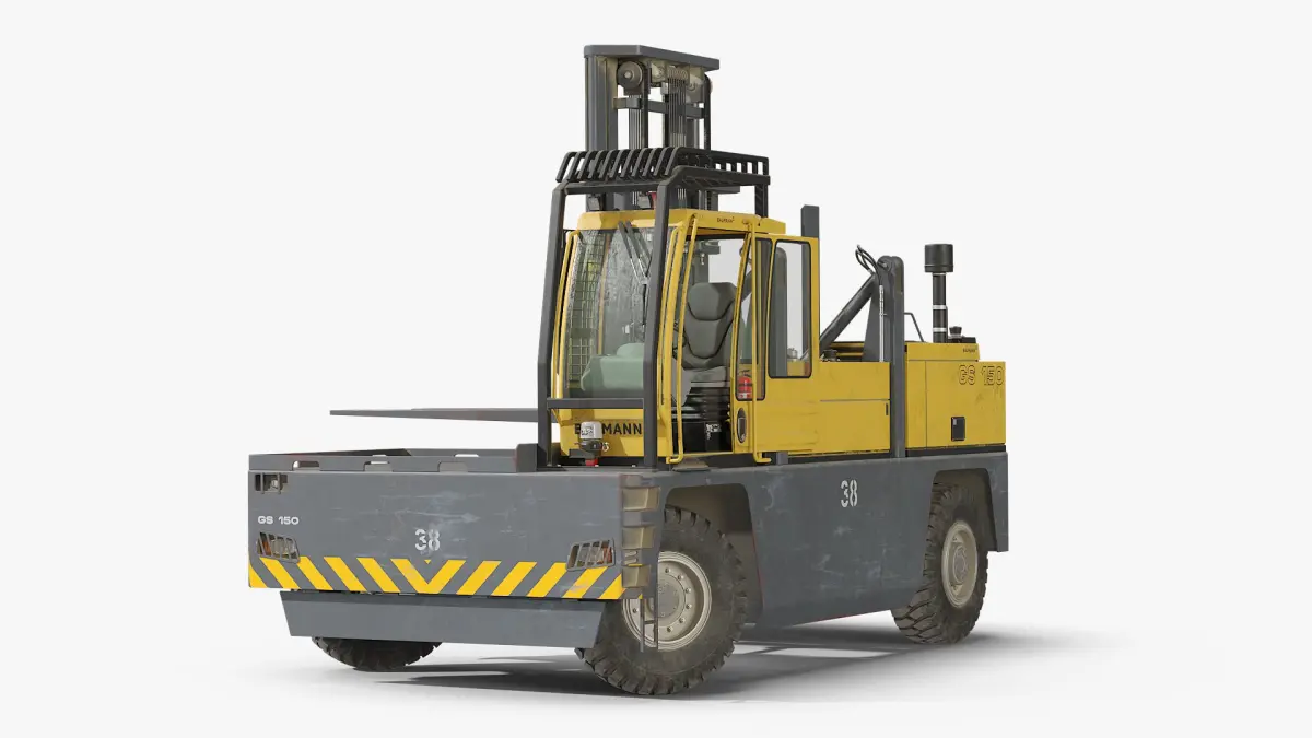 Baumann GS 150 Long Load Forklift Used Rigged for Maya is a three-dimensional model of Baumann GS 150 yard shuttle carrier that is an industrial vehicle used for transporting heavy loads within cargo yards and ports.