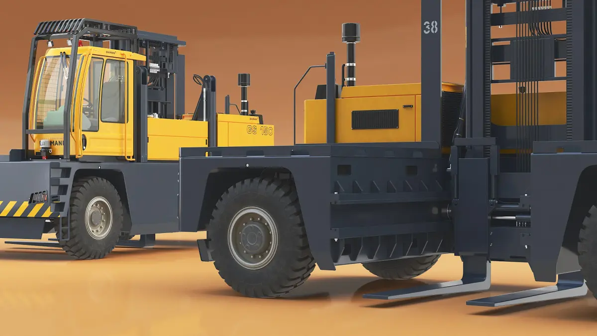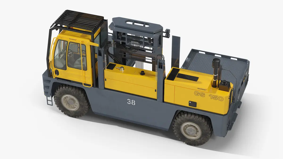 Baumann Sideloader Truck GS is a three-dimensional model of GS 150 yard shuttle carrier that is an industrial vehicle used for transporting heavy loads within cargo yards and ports.