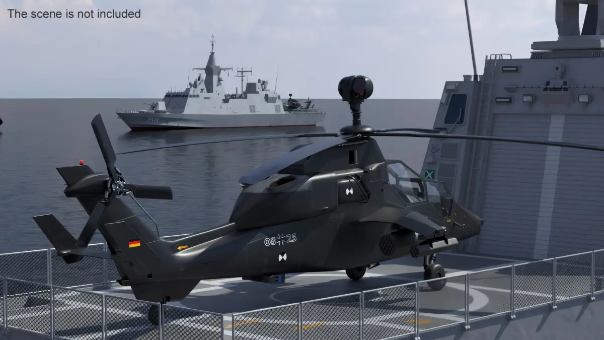 Baynunah Class Corvette with Eurocopter Tiger EC665 is a 3d model of a naval vessel and helicopter combination, featuring the Baynunah Class Corvette and the Eurocopter Tiger EC665 attack helicopter, both designed for modern naval operations.