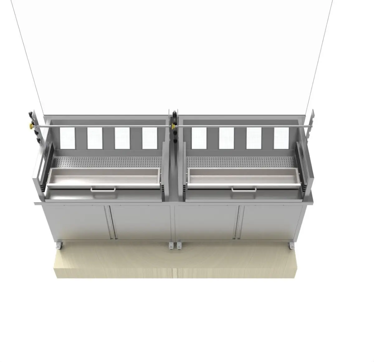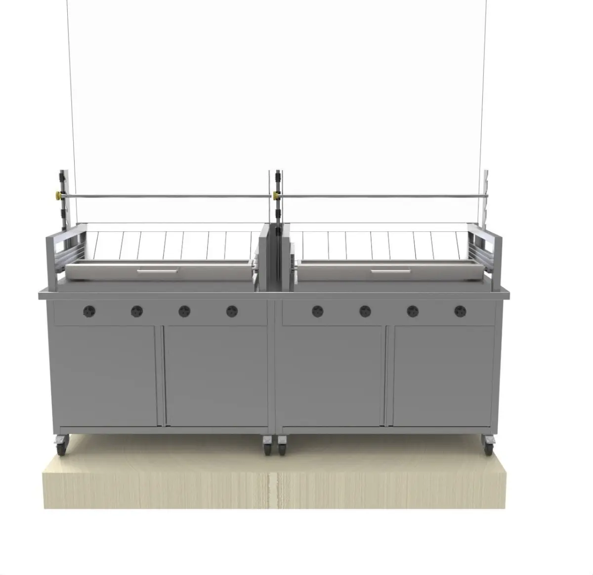 *Gas shawerma machine. *. UNDER BASE CABINET .. cap: 1 units / 4burners each. . 4 high pressure gas valves.. burners.. meat skewer.. manual rotating. . construction scotch bright finish 18/10 aisi 304.