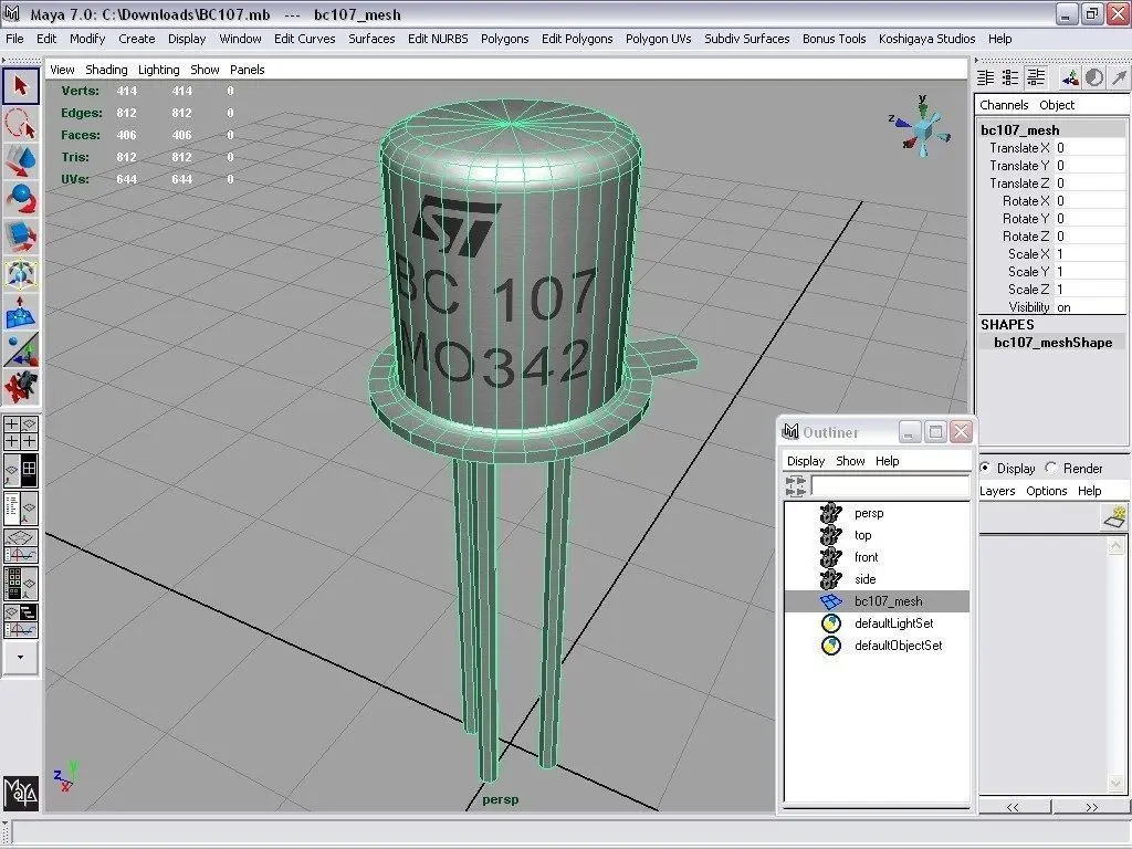 Low poly BC 107 transistor model, built with Maya 7, clean topology, no N-gons and triangles, quads only.UV mapped, unwrapping done with overlapping, rendered with V-ray renderer in 3ds Max (render scene included). Basic blinn material with Layered Textures node in Maya file.Maya 7 (.ma, .mb), OBJ (.obj with .mtl), 3ds Max 2009 (.max) and Autodesk FBX (.fbx) format included. FBX and OBJ are directly exported from Maya.Polygons: 406Vertices: 414Textures included in bc107_maps.zip file:-2048×2048 .tiff and .jpg opacity (transparent) map for label-2048×2048 .tiff and .jpg diffuse (color) map - not used in render scene