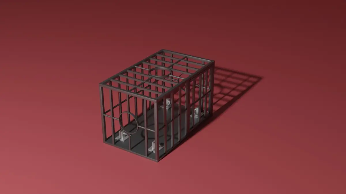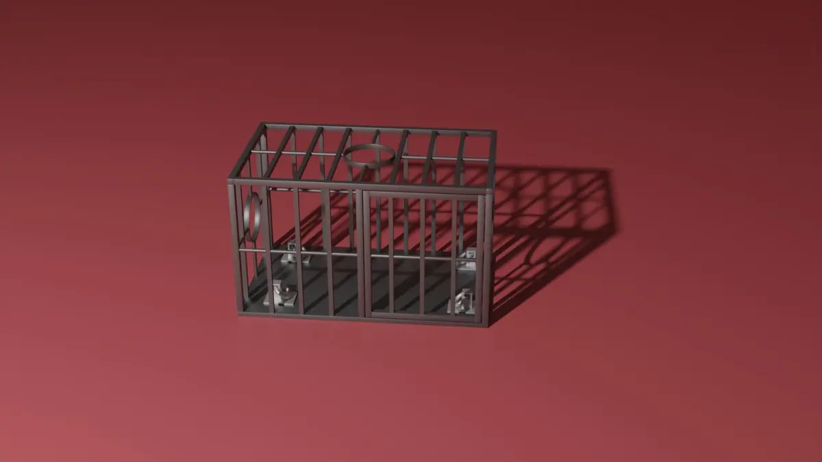 A metal BDSM cage with a small door on the side. It has multiple opening for the head and links that can be used to tie somebody down. The model is made in Blender 3.0 and rendered in Cycles.