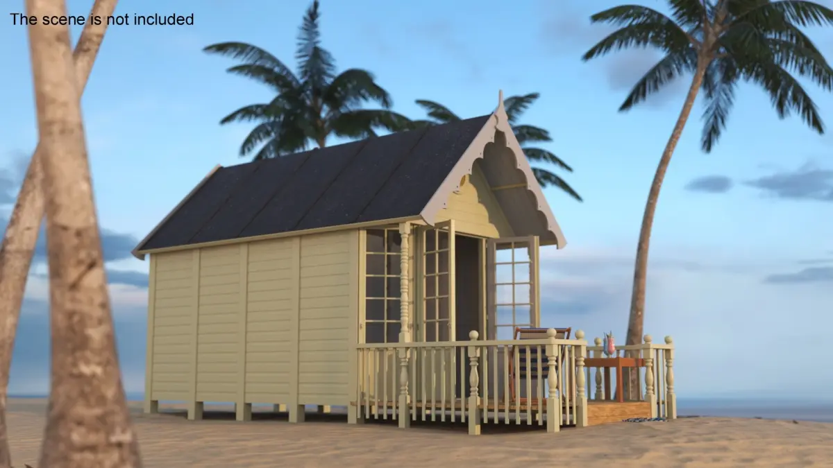 This delightful model features a quaint design with a sloped roof and decorative trim. The wooden structure includes a small porch area with railings, ideal for relaxing and taking in the view. The model captures the essence of seaside retreats, complete with palm trees and beach accessories, providing a realistic and inviting atmosphere.