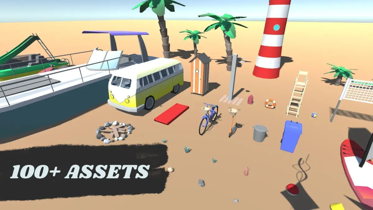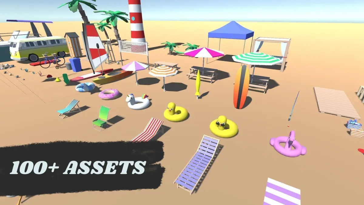 Models:Seagull with walking animationCrab with walking animationLifeguard Tower (9 color variations)Van (7 color variations)JetSki (7 color variations)PedalBoat (7 color variations)Hammock (7 color variations)FittingRoom (7 color variations)WindsurfBoard (7 color variations)Kayak (3 color variation)Kayak paddleBuoy x3 (1 to 3 color variations)SurfBoard (19 color variations)Picnic Table BasicLifeguardChair (2 color variations)Lifesaving Float x2BoatShowerPortableRefrigerator x 3BonfirePergola (7 color variation)PicnicTable with Umbrella x2 (7 color variation each one)LoungerFloat (7 color variation)Float Basic (14 color variation)Flamingo Float Duck Float x2Unicorn FLoatDonut FloatKite x3 (from 3 to 7 color variation each)Racket (7 color variation)Racket ball (7 color variation)Can (7 color variation)Fishing Rod (7 color variation)Bike (7 color variation)Skate Scooter (7 color variation)Swimming Fins (7 color variation)Snorkel Glasses (7 color variation)Lounger x2 (7 to 8 color variation)Hats x3 (7 color variation each one)Bags x3 (7 color variation each one)Sunglasses (8 color variation)Flip Flops (7 color variation)Shovel (7 color variation)Rake (7 color variation)Cube (7 color variation)Ball (8 color variation)Chair x2 (7 to 11 color variation)Towel (7 color variation)Umbrella x3 (7 color variation each one)Rocks x4 (4 color variation each one)Conch x2WatermelonCoconut x3VolleyBall (5 color variation)Ice Cream x2 (3 color variation each one)Starfish x2 (2 color variation each one)SunscreenSandCastle x2Drinks x9SeaWeed x3CoralLighthouseBeach Bar x2Beach BedWalkway (3 color variation)Dock x2 (3 color variation each one)Trash Can x2 (4 color variation each one)Palm x5Big Boat