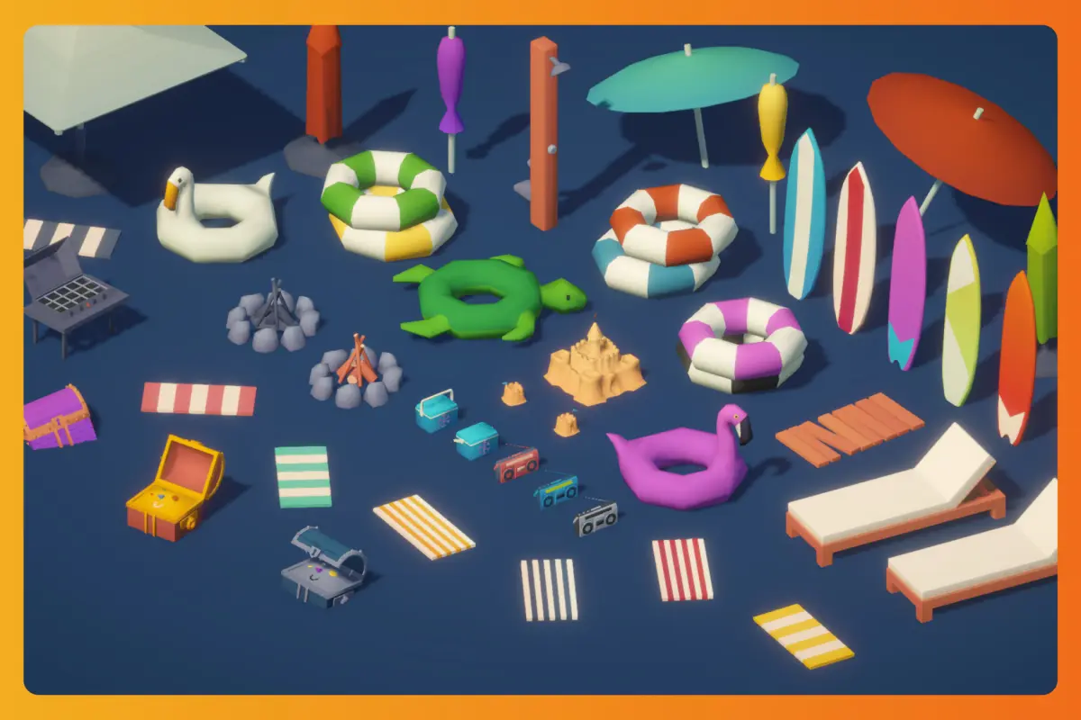 Create vibrant and relaxing coastal scenes with this stylized low poly beach prop pack, featuring 50+ game-ready models designed to bring life and detail to your seaside environments. Ideal for mobile games, casual projects, or stylized sandboxes, these props help populate beaches, resorts, or tropical islands with ease.Included elements:Umbrellas, loungers, towels, surfboards, floaties