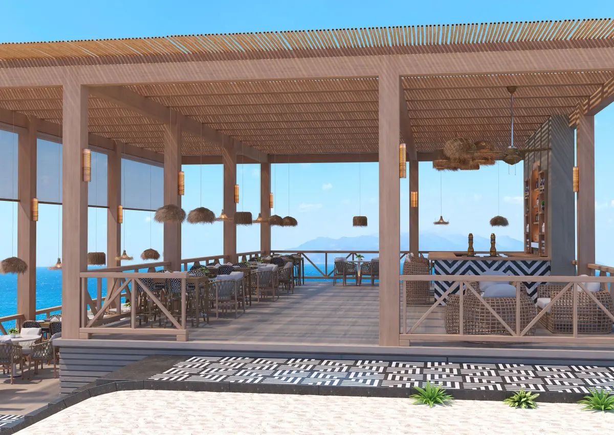 This is a Sea side snack bar Scene - (Render Ready)All models included - Tables ChairsBarRattan daybedRattan furnitureBar stoolsSnack barRattan lightings and more..