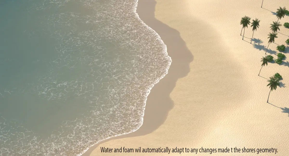 If you modify the shoreline, the ocean, foam, wet sand etc. will update accordingly without the need to paint textures. Everything in the shaders is aptly named, also included is an instructional image file, detailing which setting affects which portion of the shoreline in case you wish to change its appearance.