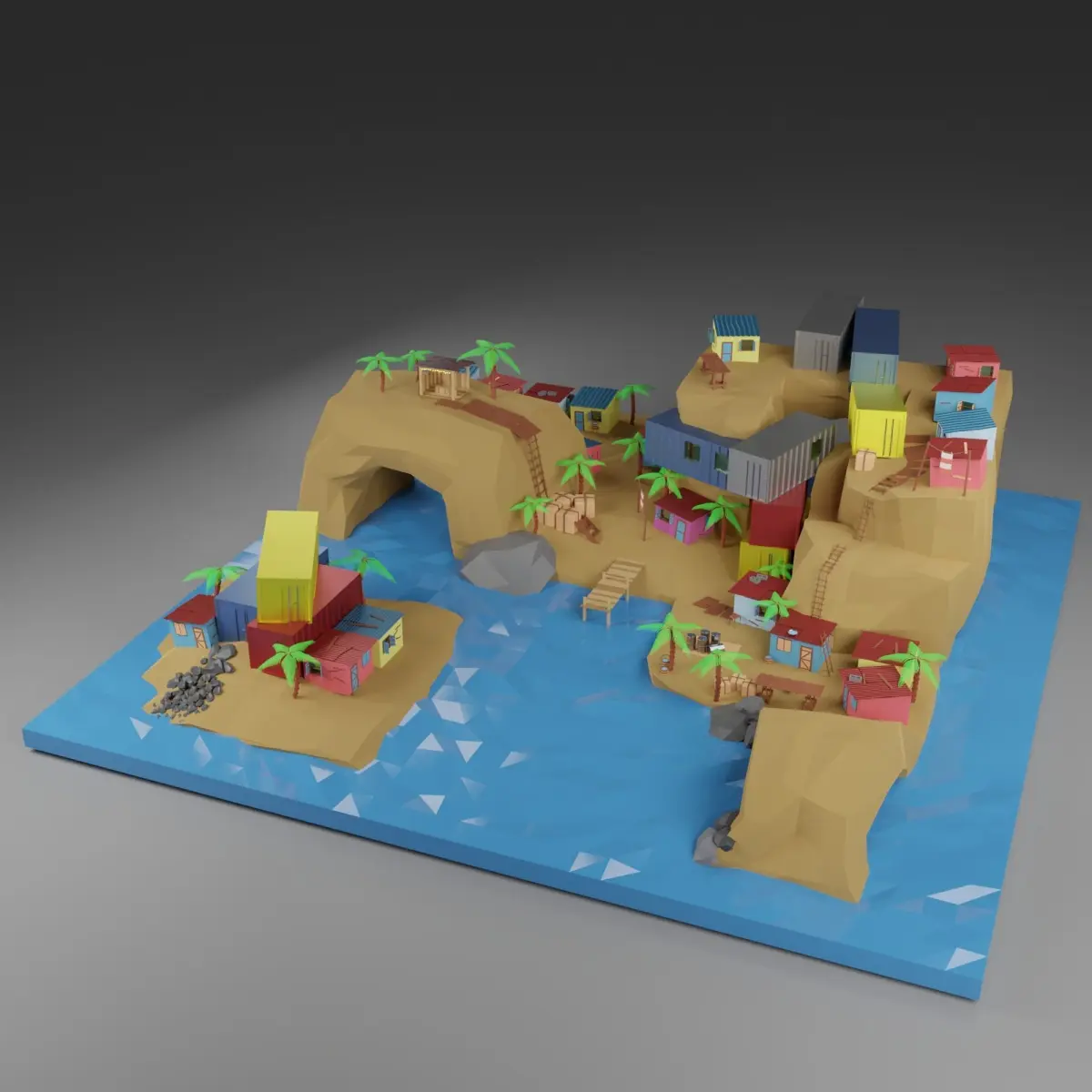 Modern buildings and architectural solutionsBeach with lifeguard cabin.container houses.palm trees and benchesAll objects are correctly attached and named.