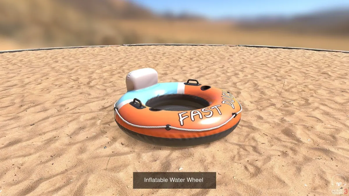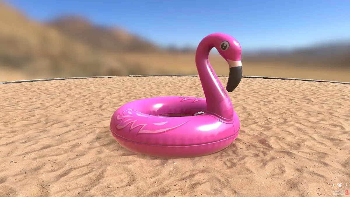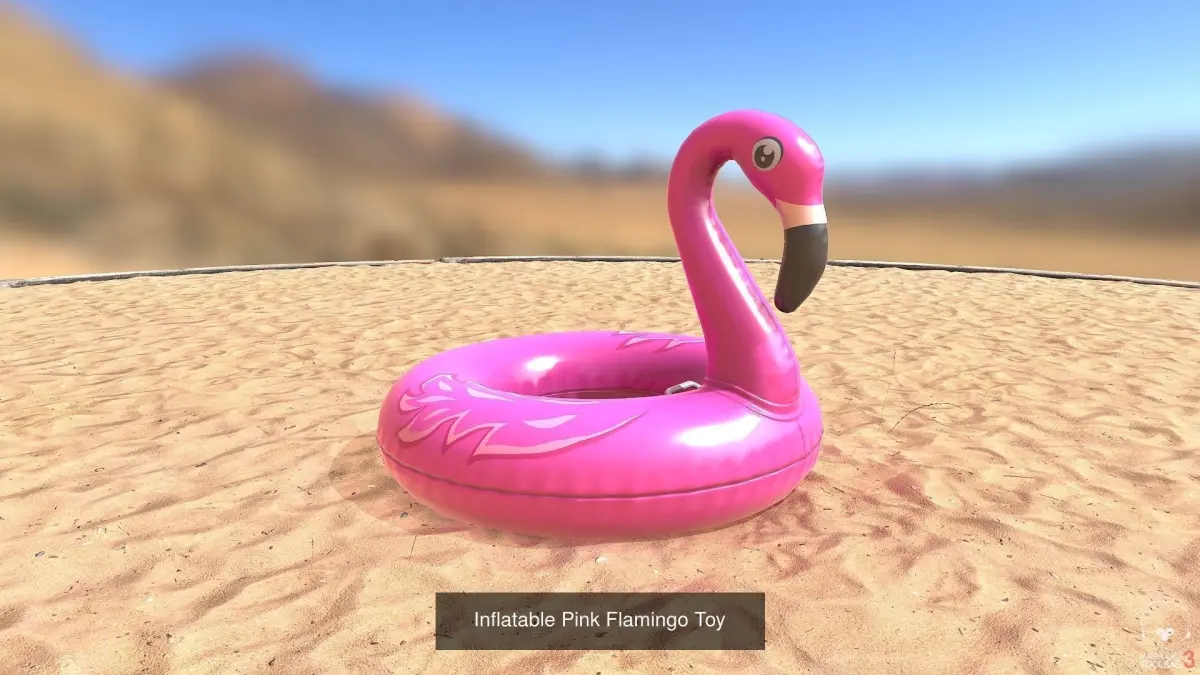 There is a Beach Ball, Volleyball, Volleyball Net Set, Inflatable Wheel, and Inflatable Pink Flamingo.