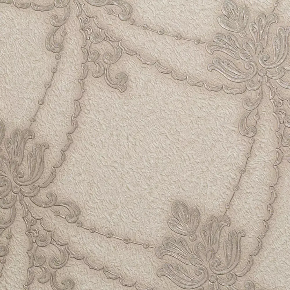What’s includedSeamless wallpaper featuring a delicate swag‑and‑trellis pattern with bead accents on an ivory plaster‑like ground for refined living rooms and foyers.