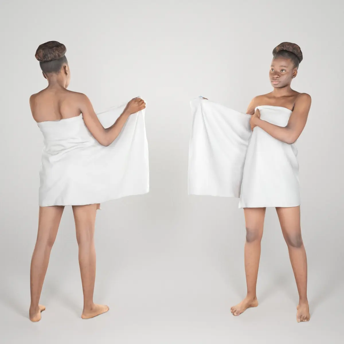 This is a true human size and detailed model of a sporty beautiful young woman of African appearance. The model is captured in a sexy pose wrapped in a white bath towel to be perfectly matching for variety of architectural visualizations, e.g. interior visualisation, gym dressing room, beach, shower, VR/AR content etc.