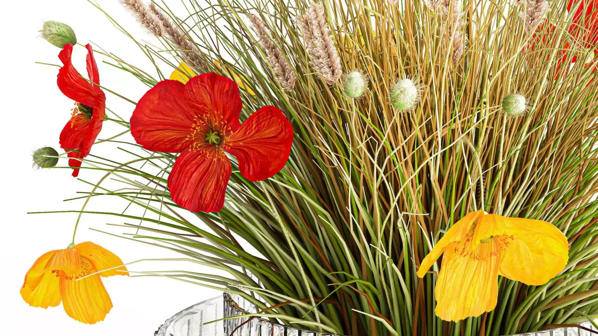Beautiful bouquet of red and yellow wild flowers with poppy grass in a glass vase. Set 608.Beautiful bouquet of wild flowers in a modern glass vase with Poppy bald-stemmed.Summer bouquetWildflower bouquetvasePapaver nudicaule - Poppy bare-stemmed, Icelandic poppyWedding decorrealistic, formal, festive, wedding decor