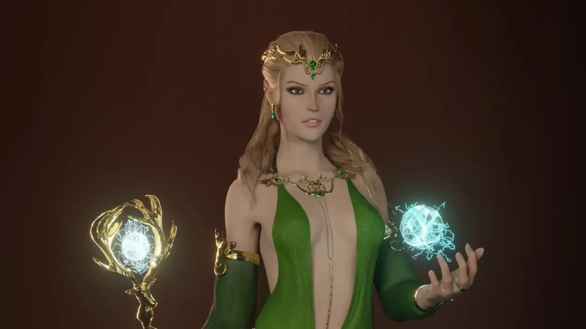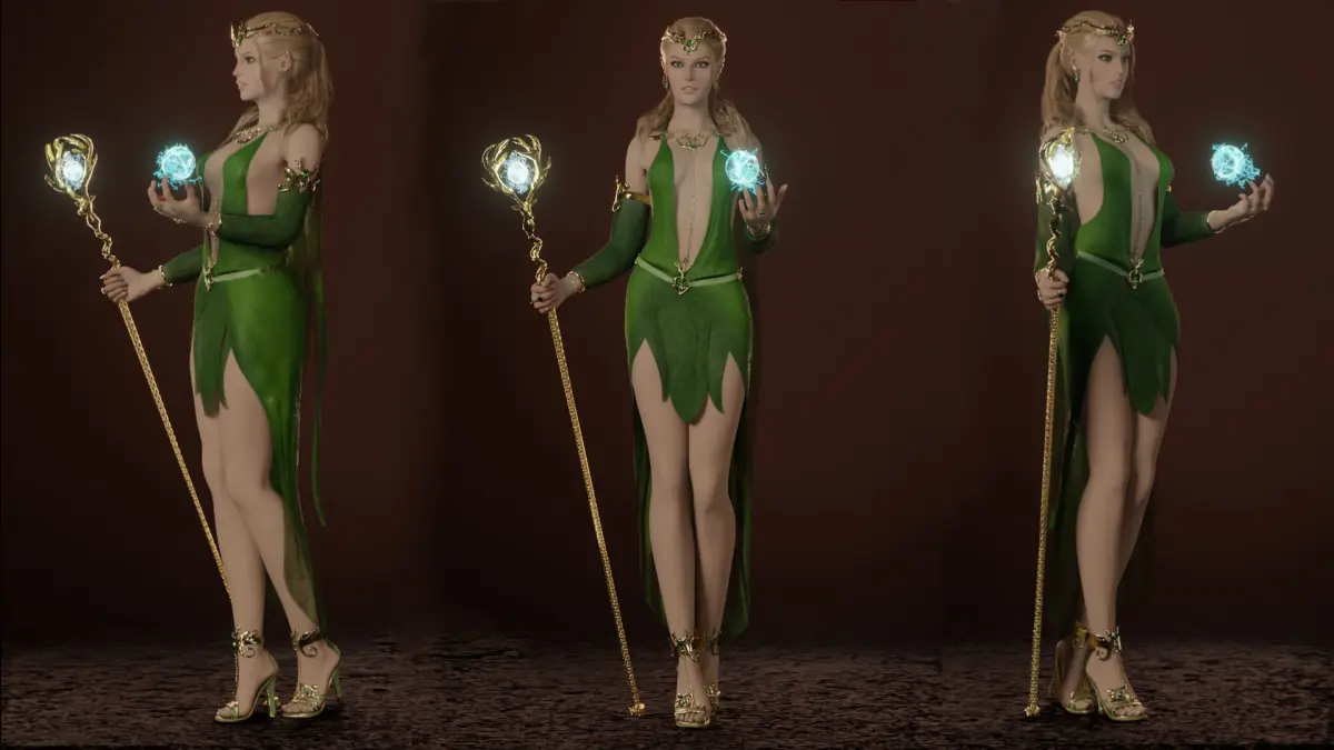 This is a model of an elven wizard of the forest. Polycount is before triangulation of clothes after it is 76152 in total.The amount of polygons before any subdivision and triangulation applied: body - 13058; hair - 12666; eyes - 1020; outfit in total - 23575; dress with a diadem - 8763; sleeves - 10420; shoes - 4090; staff - 12054; magic orb - 20808. Note - magic orb is just to create some magic effects and should be replaced by particle systems in a game engine! All pieces of clothes are removable! The model has been rigged via biped in 3ds max and has all basic animations: walking, sheathing the staff in/out, attack 1, attack 2, attack 3 jumping and running to implement in game engines. There are also some morph targets or shape keys to make some basic facial animation. Hopefully you'll find a good use of her.