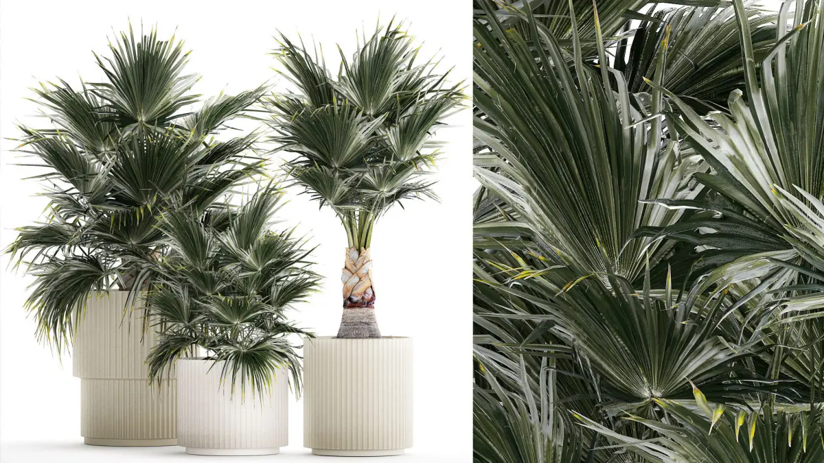 Beautiful fan palms in flower vases for decoration