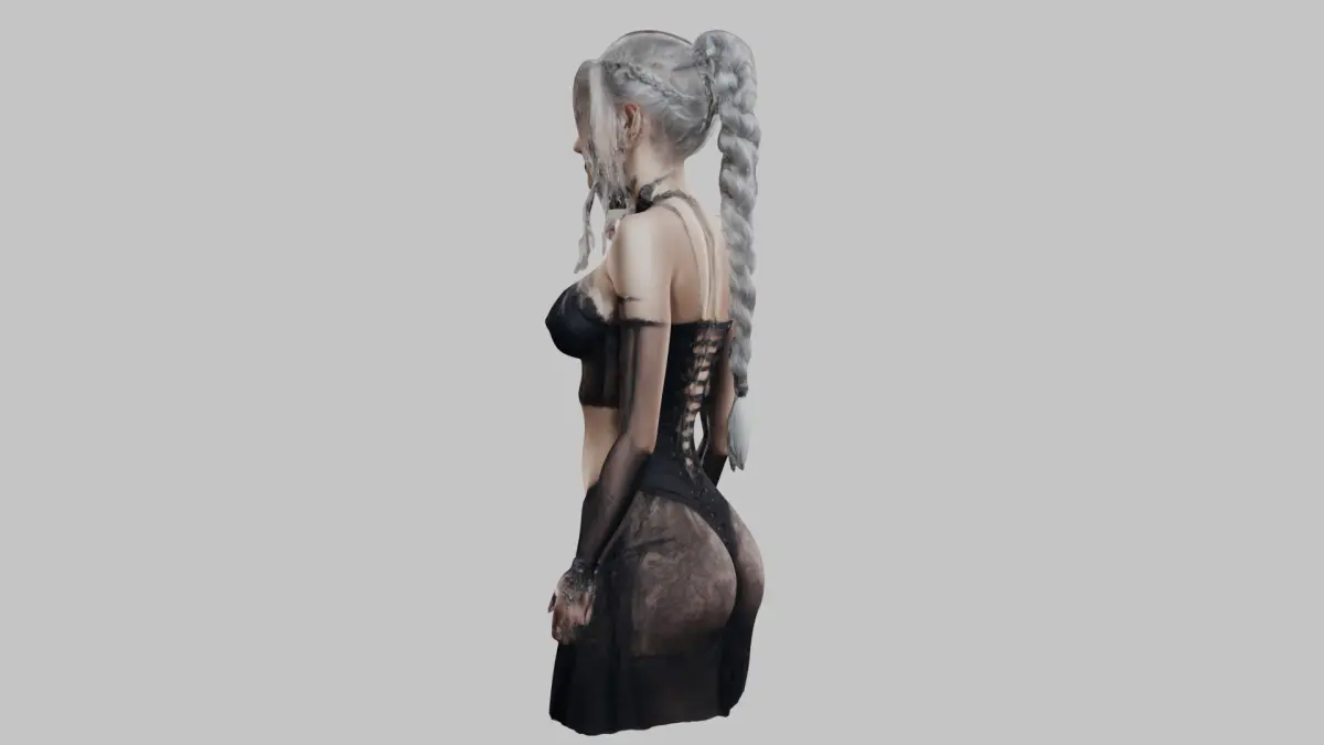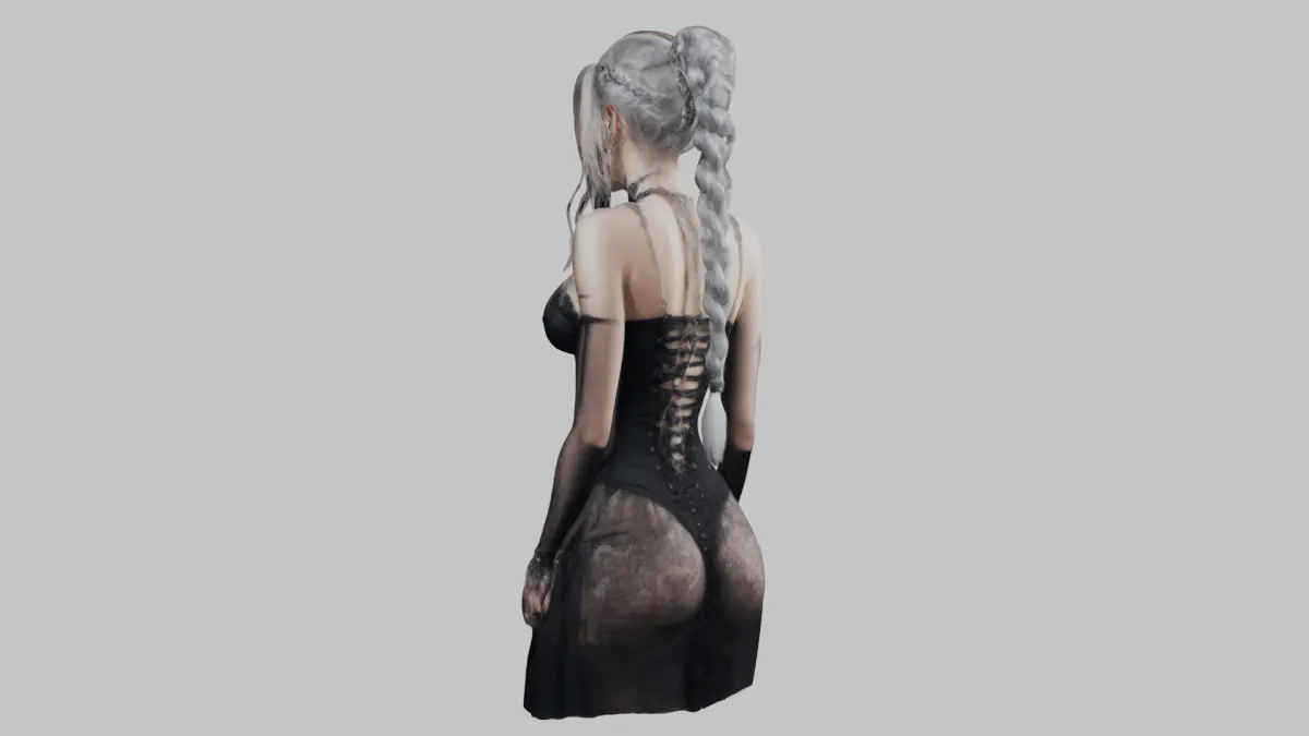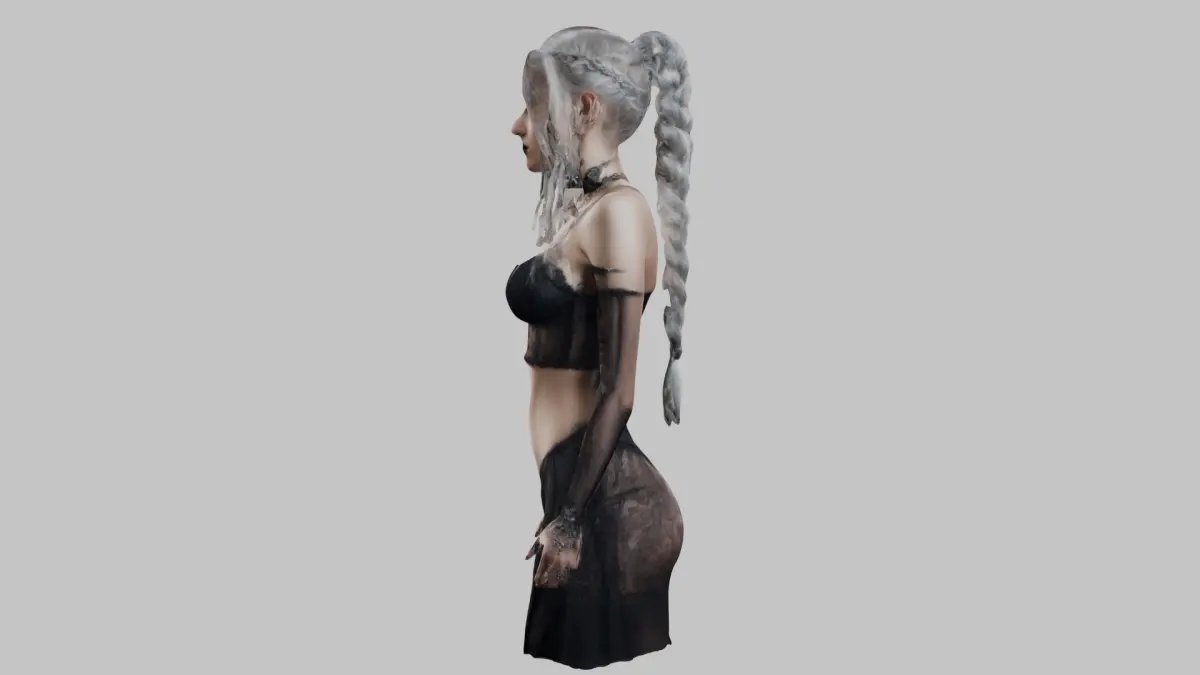 - Despite its low-poly nature, the model includes stylized details such as textured clothing, flowing hair, and minimalistic facial features like dark makeup and piercing eyes.