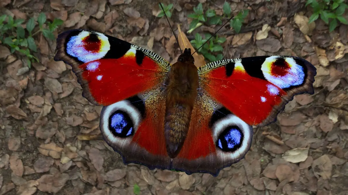 The length of the fore wing is 27-31 mm. Wingspan up to 62 mm. Females are most often somewhat larger than the male. The main background of the wings is red-brown, red-brown. On the wings there are 4 large eyes with blue spots. The coloration of the daytime peacock's eye is influenced by cold and warmth acting on the pupa. The underside of the wings of a patronizing color is black-brown, with rows of wavy, lighter colored, sinuous lines.