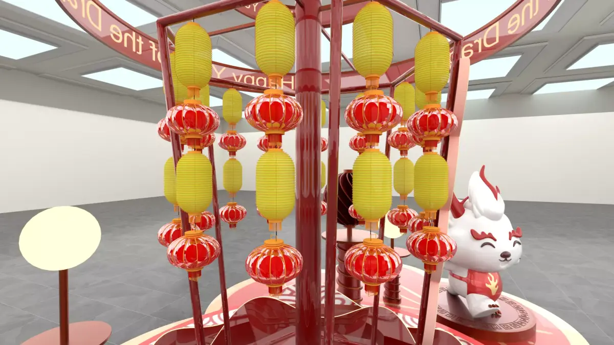 Thiết kế trong hình mang đậm dấu ấn của Tết Nguyên Đán và tinh thần năm Thìn, kết hợp hài hòa giữa tính truyền thống và hơi thở hiện đại. Trung tâm là mô hình vòng xoay trang trí với sắc đỏ – vàng chủ đạo, biểu tượng cho may mắn, thịnh vượng và hạnh phúc. Vòng tròn phía trên nổi bật dòng chữ “Happy Year of the Dragon”, khẳng định chủ đề năm Rồng đầy khí thế.